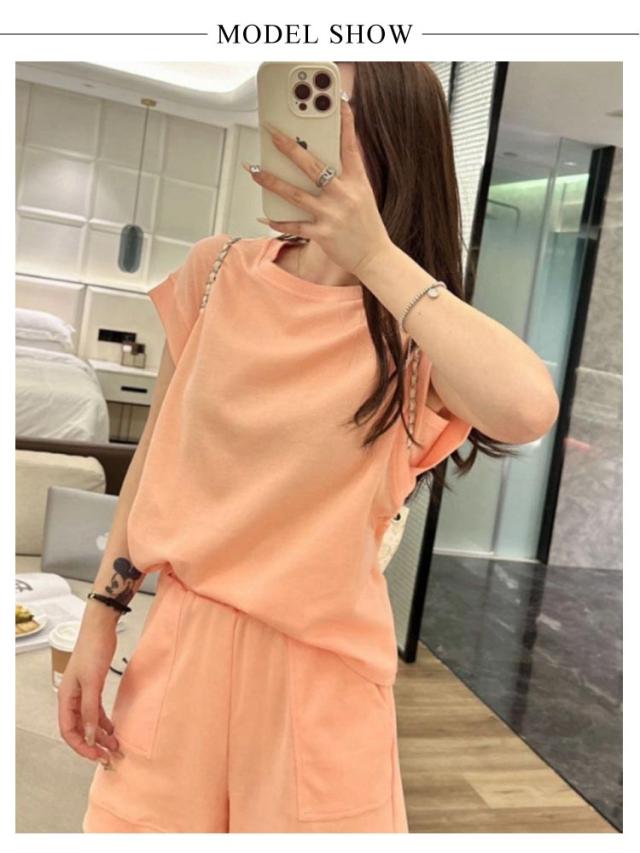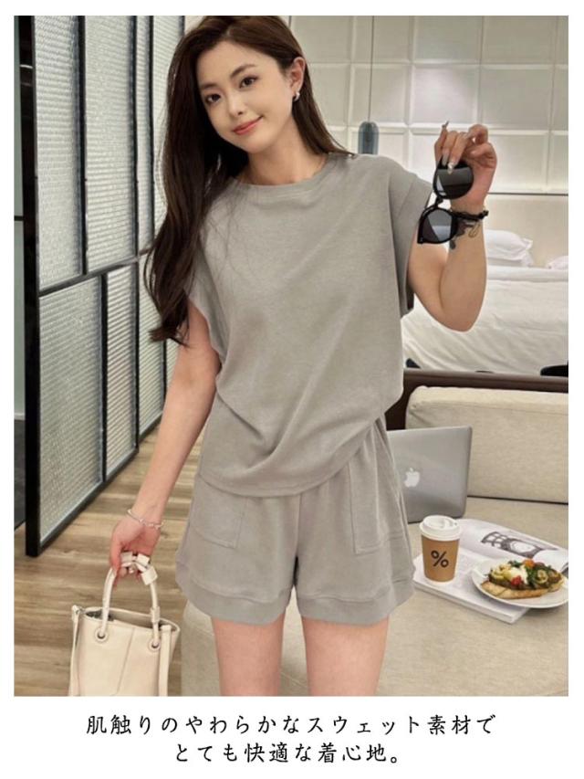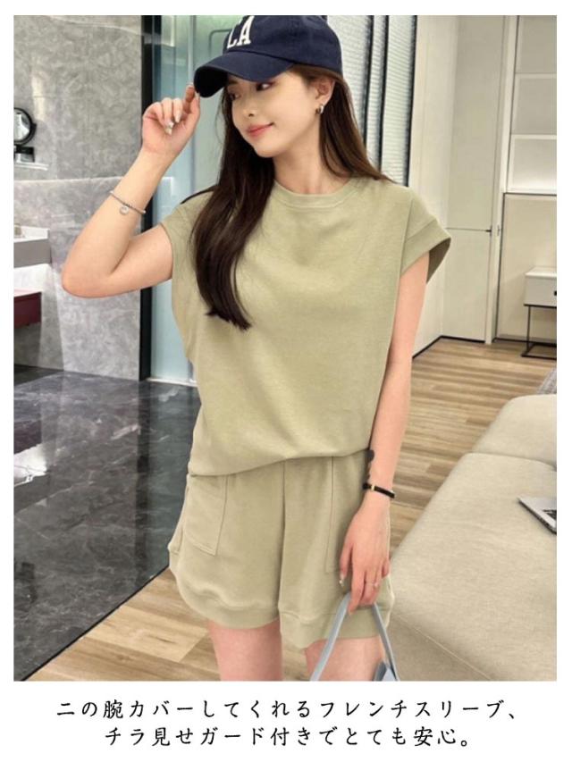 | お家タイムをお洒落に楽チン♪ 肌触りのやわらかなスウェット素材でとても快適な着心地。 二の腕カバーしてくれるフレンチスリーブ、チラ見せガード付きでとても安心。 軽量で動きやすい、ルームウェアや普段着としてはもちろん、ジムに行く際のスポーツウェアなど様々なシーンで着ていただけます。 上下セットで着回し力抜群、気分に合わせてコーデが自由自在。 | |