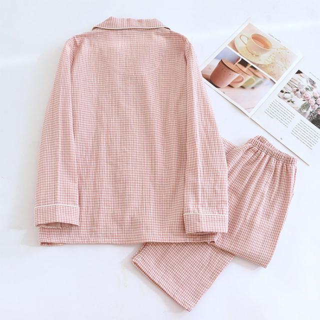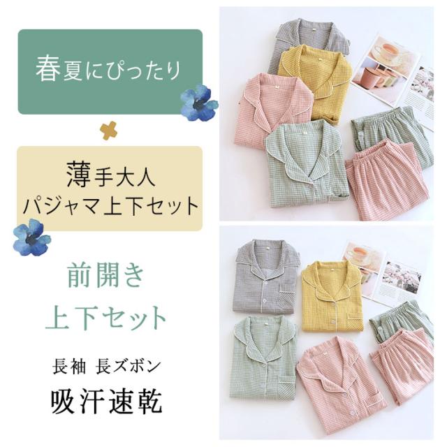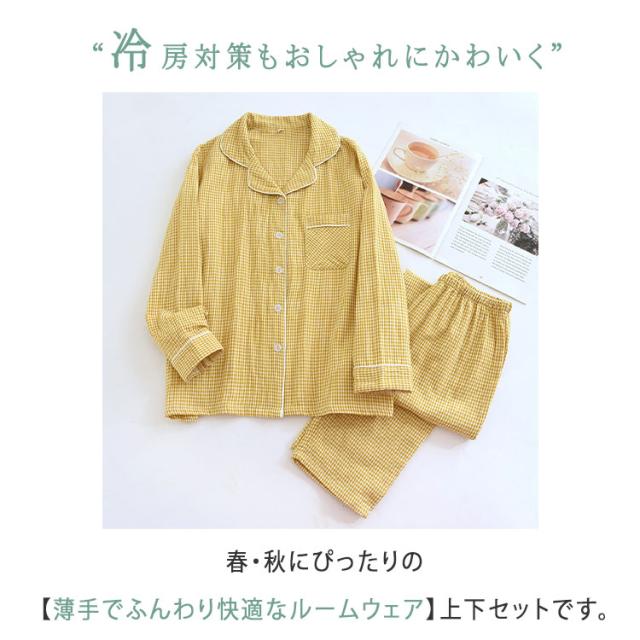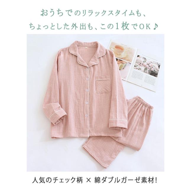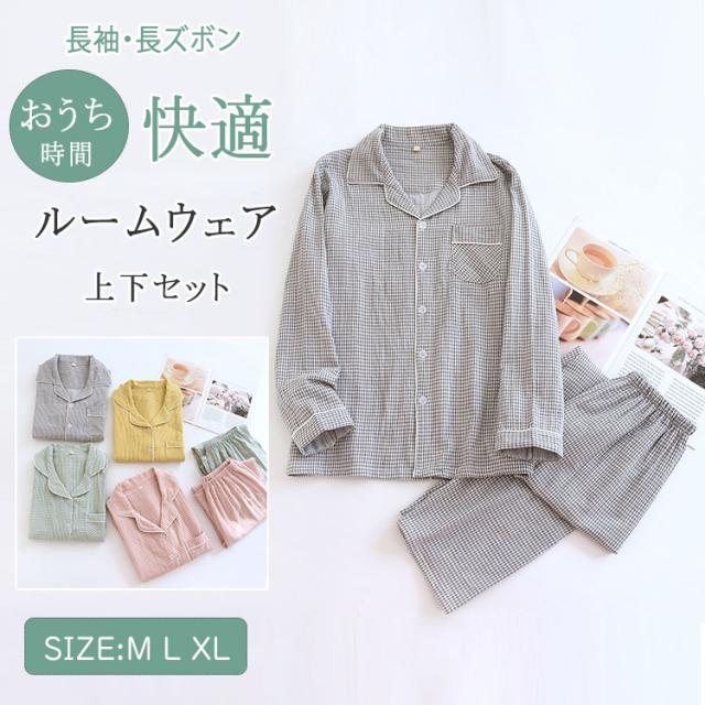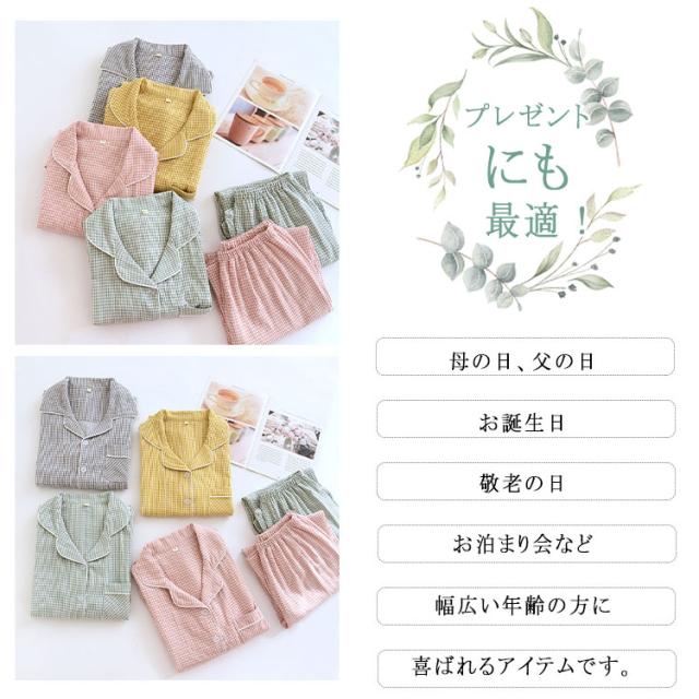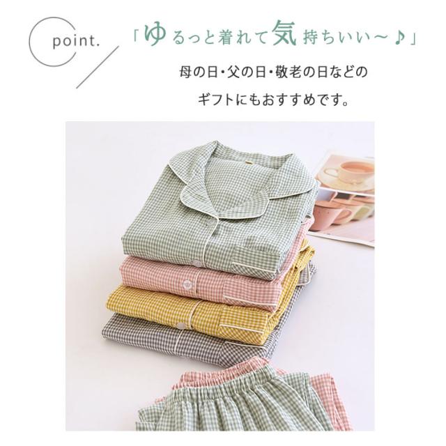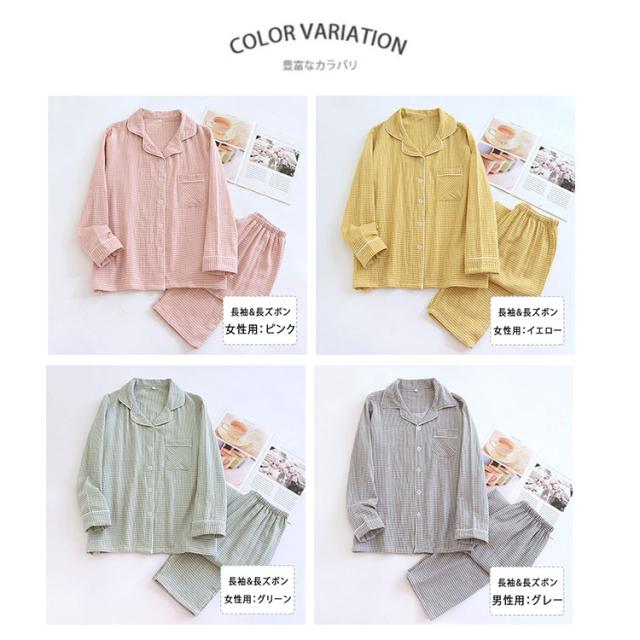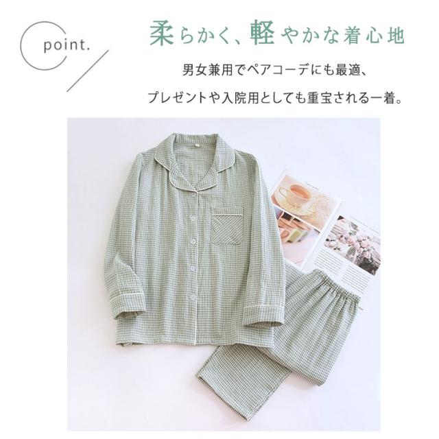 ルームウェア パジャマ レディース メンズ ペアパジャマ 上下セット 綿 ダブルガーゼ 長袖 ロングパンツ チェック柄 前開き 春 秋 薄手 吸汗速乾 部屋着 ナイトウェア 入院着 寝巻き お揃い 快適 ふんわり ギフト対応 母の日 父の日