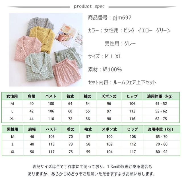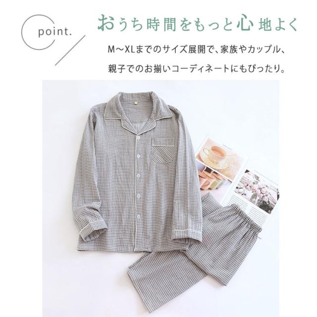 商品名 | ルームウェア パジャマ レディース メンズ ペアパジャマ 上下セット 綿 ダブルガーゼ 長袖 ロングパンツ チェック柄 前開き 春 秋 薄手 吸汗速乾 部屋着 ナイトウェア 入院着 寝巻き お揃い 快適 ふんわり ギフト対応 母の日 父の日 |