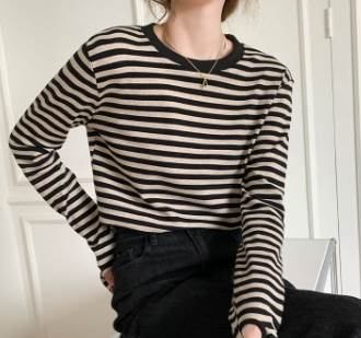 ラウンドネックのデザインは、顔周りをすっきりと見せながら、女性らしい抜け感も演出。