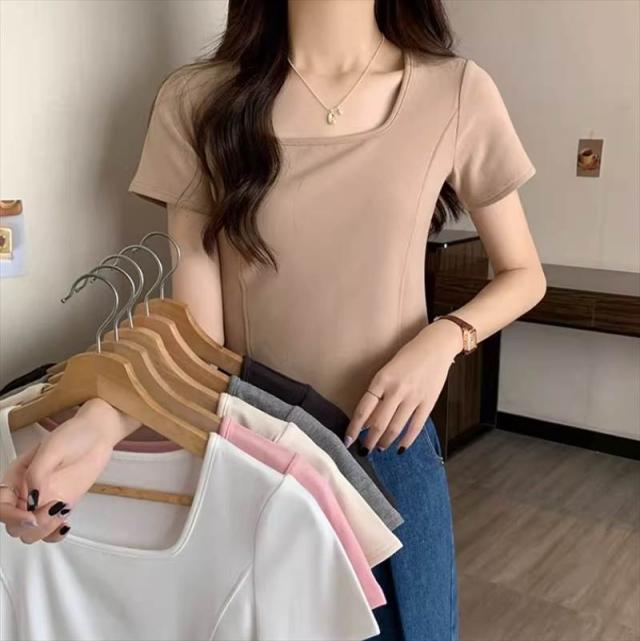 レディース トップス Tシャツ ショート 半袖 スクエアネック タイト スリム 細身 かわいい 大人可愛い きれいめ シンプル カジュアル ガーリー クール 無地 夏 学生 デート お出かけ 休 学校