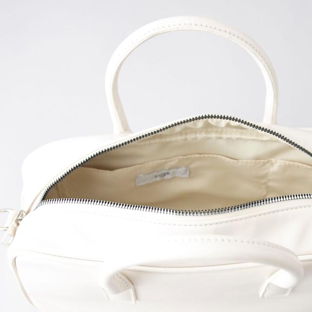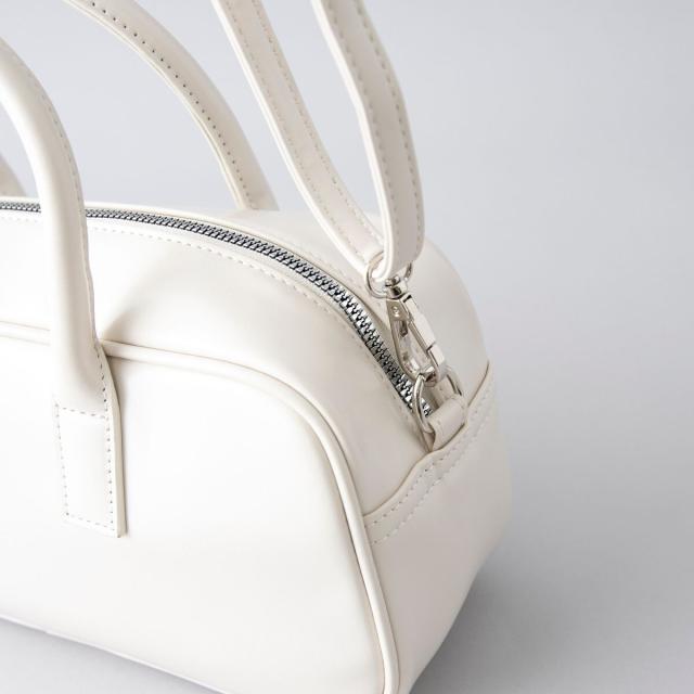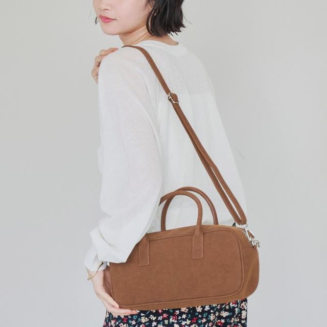 端正なスクエアフォルムが印象的なボストンショルダーバッグ。
