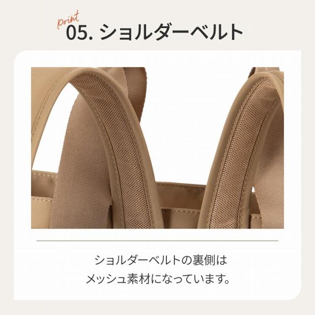 ツヤ感のあるナイロン素材に、フェイクレザーをポイント使いすることで上品で洗練されたデザインに仕上げました。