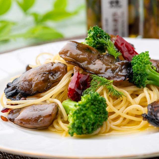 <牡蠣のアヒージョ>牡蠣とニンニクをオリーブオイルで煮込みました。温めるとより一層美味しく召し上がれます。お好みの野菜と一緒に煮込んだり、パスタやチャーハンにお使いいただいたりなど、アレンジもお楽しみいただけます。