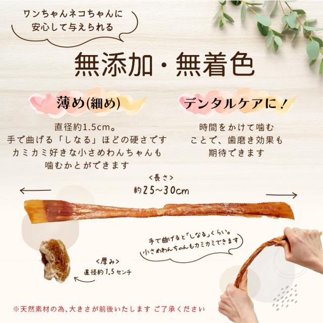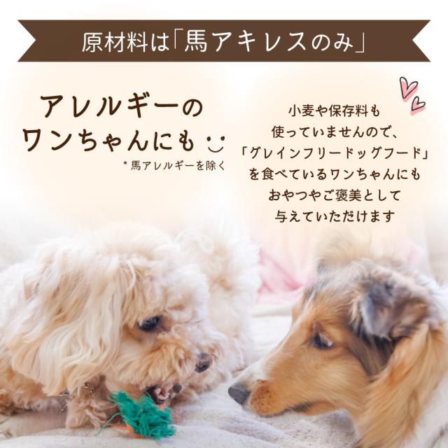 無添加、無着色で低温乾燥(30℃)でじっくり3日間乾燥し、旨味・風味を閉じ込めました。 低カロリー、高たんぱくな馬アキレス。 硬い仕上がりなので長時間かけてゆっくり食べられます。 そして馬アキレスには「グリコーゲン」が豊富に含まれています。 グリコーゲンとは、体にすばやく吸収されるエネルギー源。 運動量が多いわんちゃんやいつものお散歩のあと、シニア犬や食が細い子、病み上がりのワンちゃんの体力サポートに最適です。 「グリコーゲン」はわんちゃんの元気と笑顔をサポートしてくれる、からだにやさしく自然に働いてくれる成分です。 「馬アキレス ロング <薄>」は、長さ25cm?30cmで、厚さは直径1.5cm程度。中型犬から小型犬のわんちゃんにも喜ばれています。 馬アキレスのような硬いおやつは「カミカミ(噛み続けること)が好きなわんちゃん」におすすめです。丸呑みしがち、飲み込み癖があるわんちゃんにはお勧めできませんので、わんちゃんの習性に併せてご検討ください。 開封後は冷暗所に保管しお早めに与えてください。 与えすぎない様に注意してください。丸飲みの恐れがあります。 与えている時は飼い主さまの見ている所で与えてください。 <安心・安全へのこだわり> 薬品を使用せず、手作業で毛を除去しております。 入念に確認しておりますが、取り切れず毛が付着していることがございます。 何卒ご了承くださいませ。 |