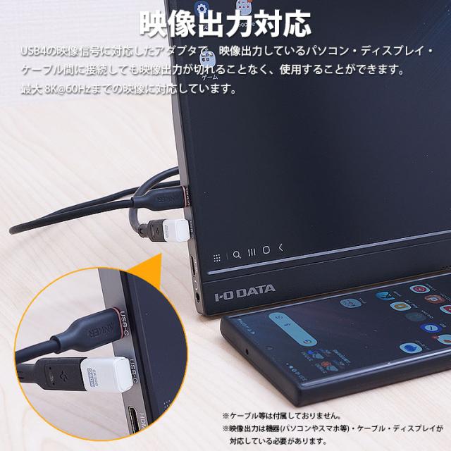 USB4の映像信号に対応したアダプタで、映像出力しているパソコン・ディスプレイ・ケーブル間に接続しても映像出力が切れることなく、使用することができます。