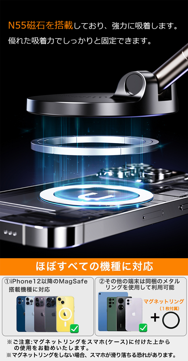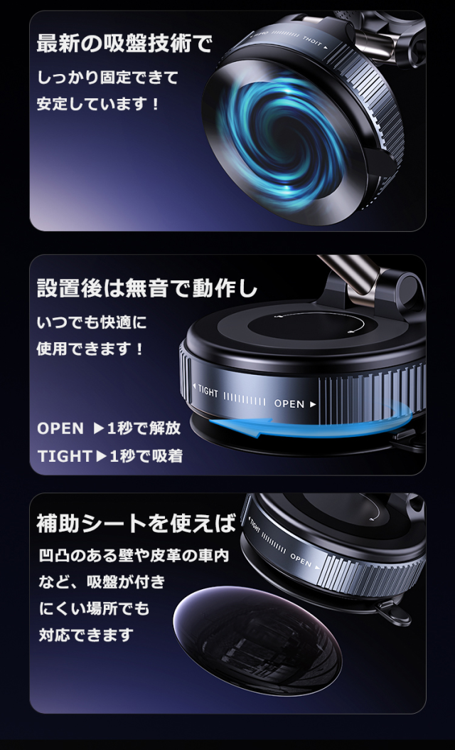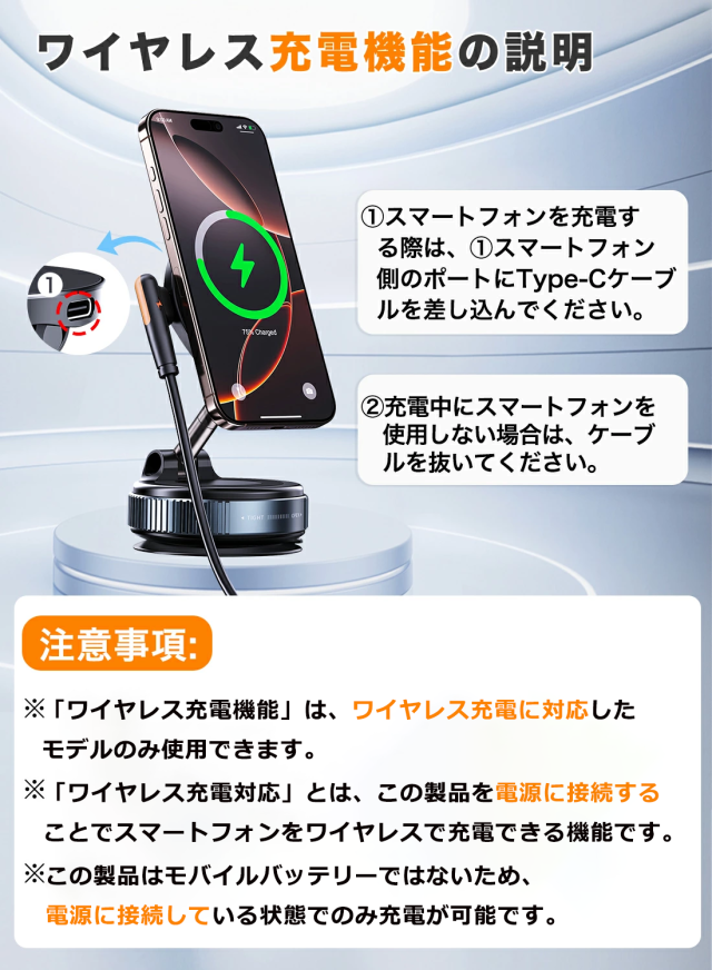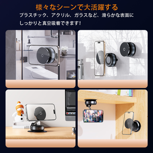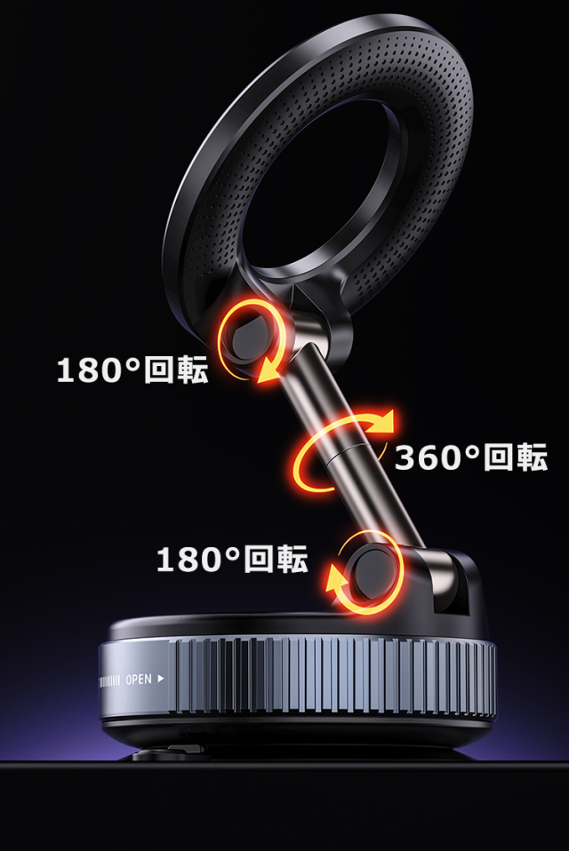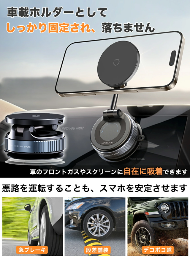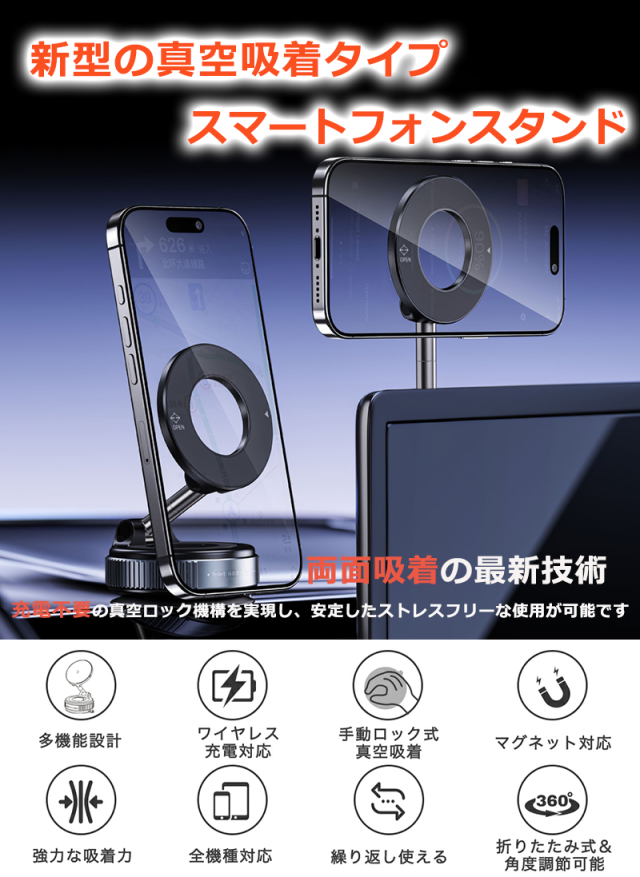 角度調整可能 マグネット式スマホスタンド 車載ホルダー ワイヤレス充電器 電動真空吸着式 安定性抜群 片手操作 簡単取り付け iPhone 16/15対応 繰り返し使用可能 タブレット