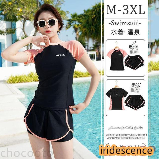 水着レディース 体型カバー 上下セット タンキニ ショートパンツフィットネス水着 セパレート 中学生水着 半袖 競泳水着 2点セット ママ水着 オトナ女子