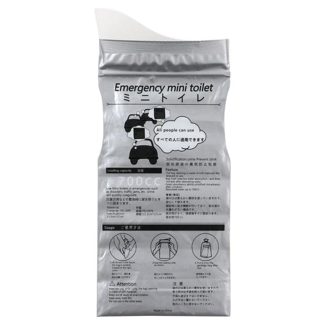緊急時に便利な携帯簡易トイレです。700mlの大容量であらゆる状況に対応できます。男女兼用の設計です。袋の口は柔らかい素材を使用しているので、安心して使えます。袋自体に吸水機能がついているので、吸水後の水漏れがない構造になっています。吸水性がよく、排尿後すぐに固まります。ポリマーを使用しているので臭いを消して、飛び散らないジェル状に変わります。災害時や渋滞、レジャーなどに!