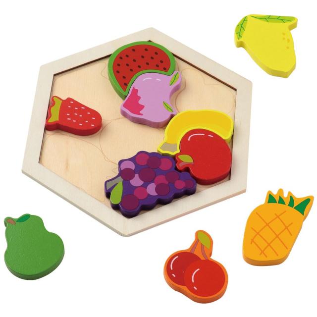 10種類の果物をモチーフにした、あたたかみのあるカラフルな木製パズルです。お子さまが安心して遊べるように、ピースの角を丸く仕上げています。自然素材の優しい質感と安全設計で、親子で一緒に楽しく遊べる知育アイテムです。