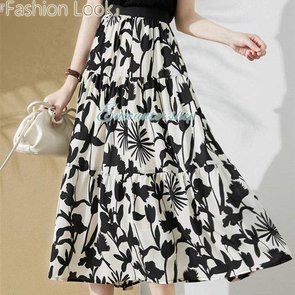 ボトムス スカート Aラインスカート シフォン Aライン 花柄 黒白配色 レディス レディース 夏 新作 2022