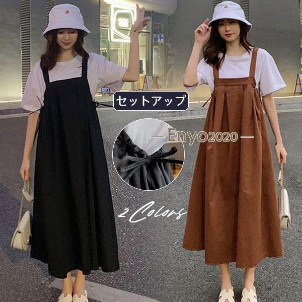 サロペットスカート 体型カバー カジュアル レディース ワンピース ロング ミモレ丈 長袖ブラウス 無地 セットアップ きれいめ 春秋