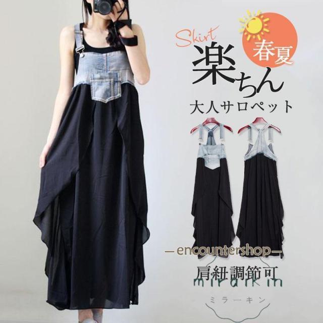 サロペット オーバーオール レディース ジャンパースカート デニム 異素材 肩紐調節可 ロング 重ね着 コーデ ゆったり 大きいサイズ 大人 お洒落 個性 かわいい