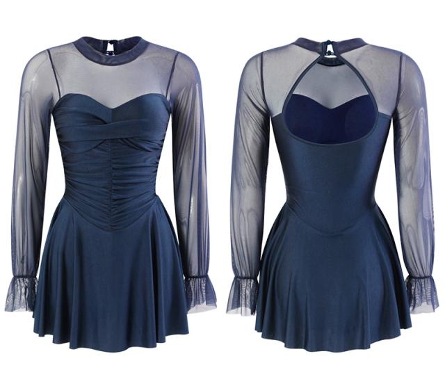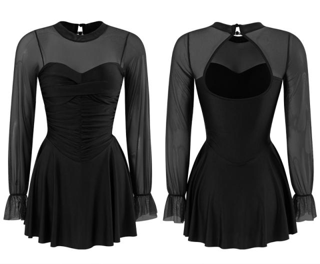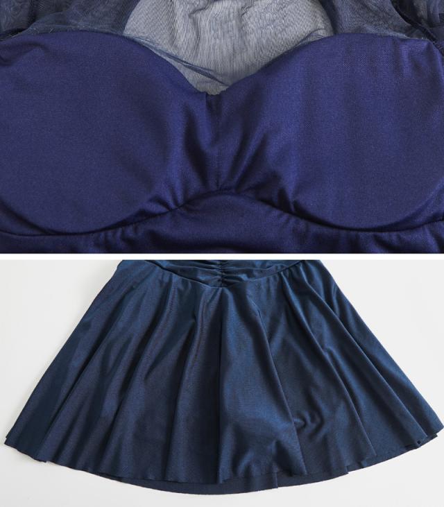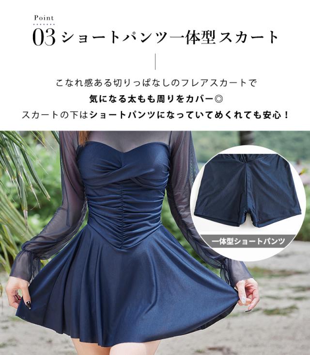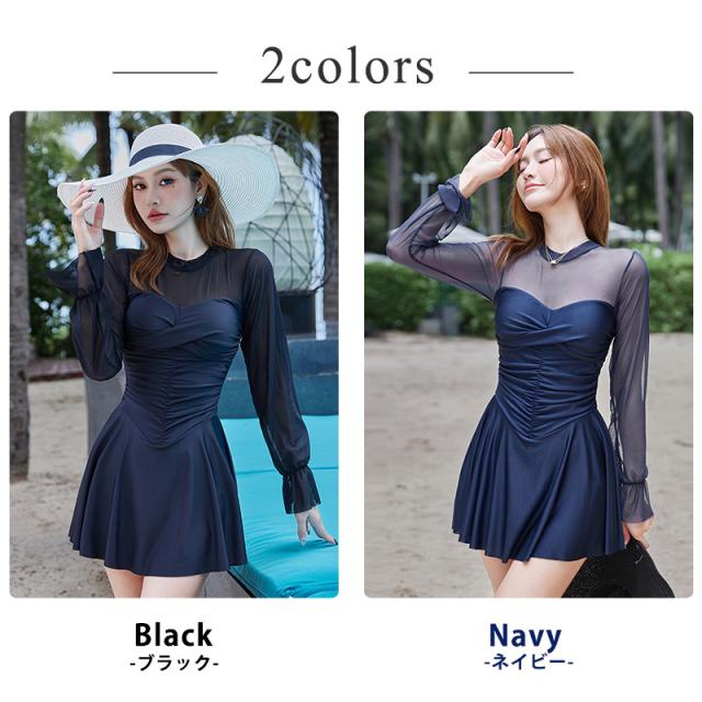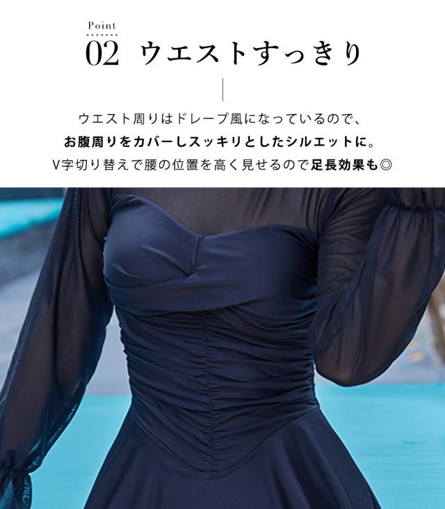 水着 ワンピース 体型カバー レディース 胸パッド付き オールインワン シアー キャンディスリーブ バックシャン フレアスカート ドレープ V字切り替え ノンワイヤー バスト 盛れる 二の腕 ウエスト ヒップ 太もも カバーアップ 無地 黒 海