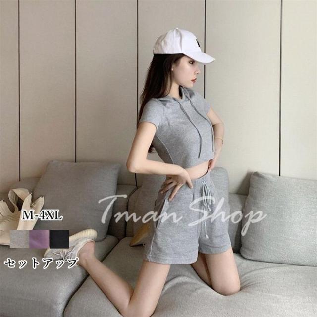 アンサンブル上下 パンツセットアップ レディース ショートパンツ ショーパン 短パン パーカー 半袖 トップス フード付き 運動 カジュアル 夏 きれいめ デイリー