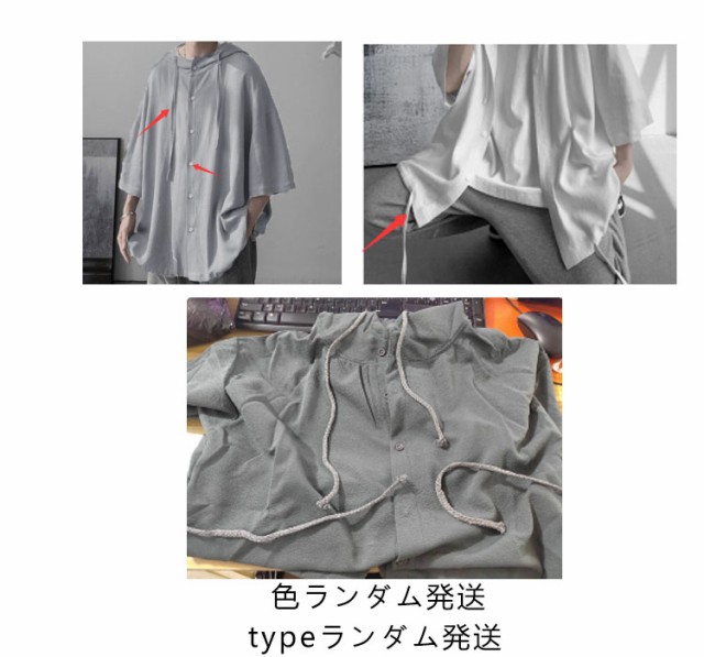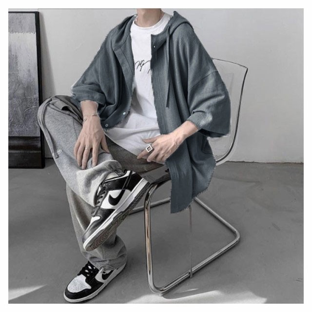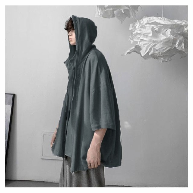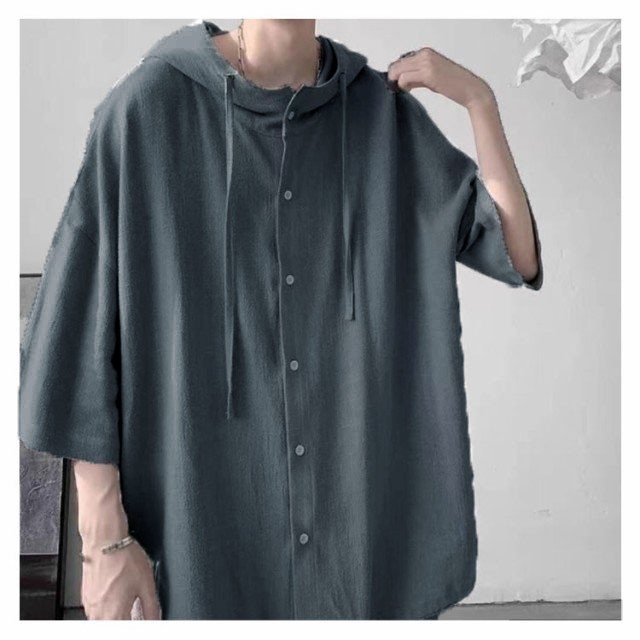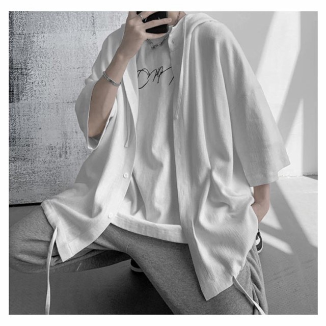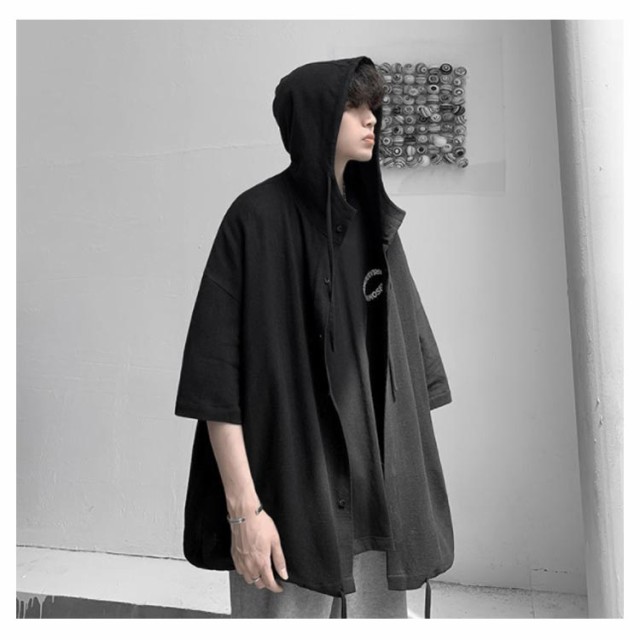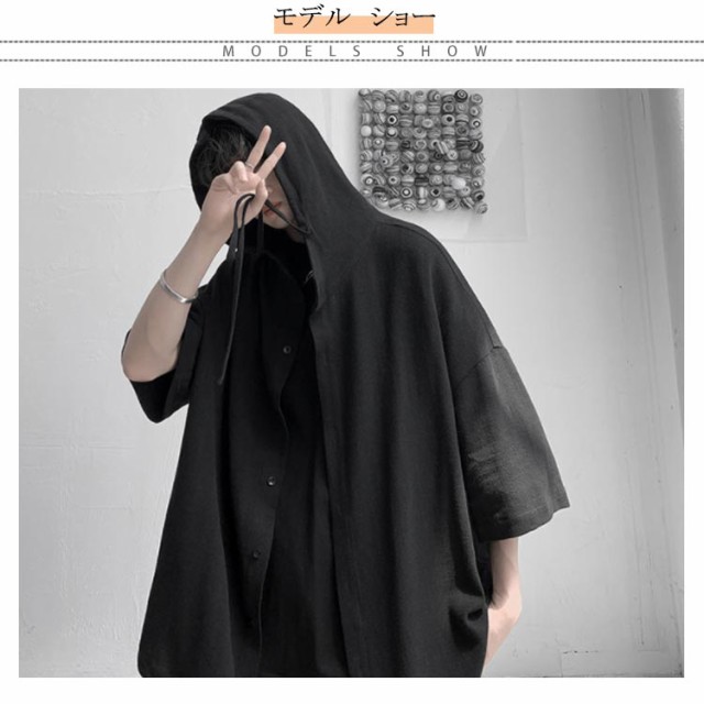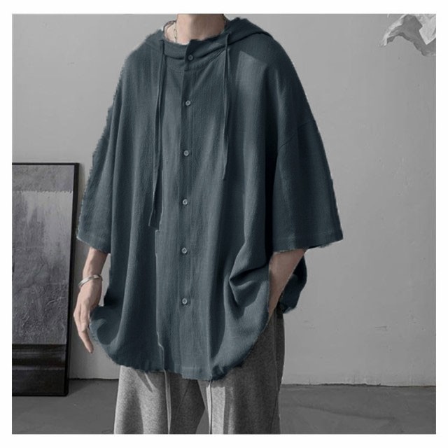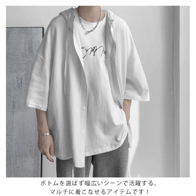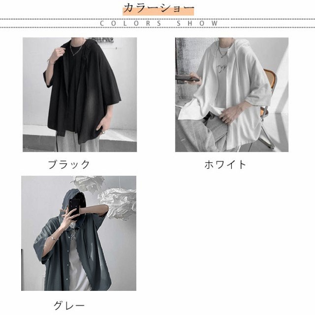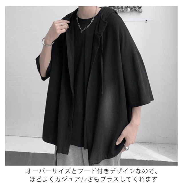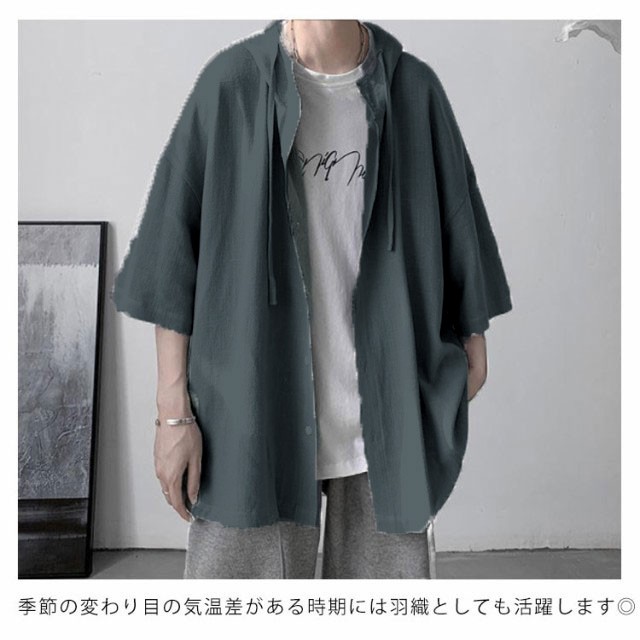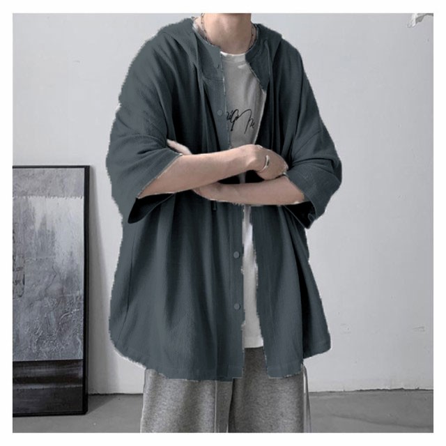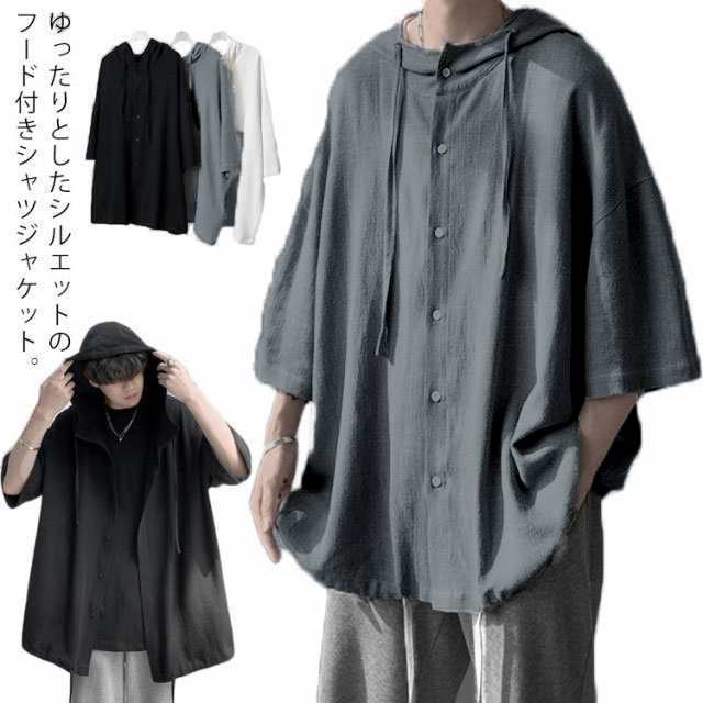 シャツ 七分袖 メンズ フード付き カジュアルシャツ シャツジャケット オーバーサイズ シャツ ビッグシャツ ビッグシルエット トップス 薄手 ゆったり アウター 羽織り ライトアウター カジュアル おしゃれ 無地 シンプル 男性用 春夏 夏 夏物 夏服 送料無料