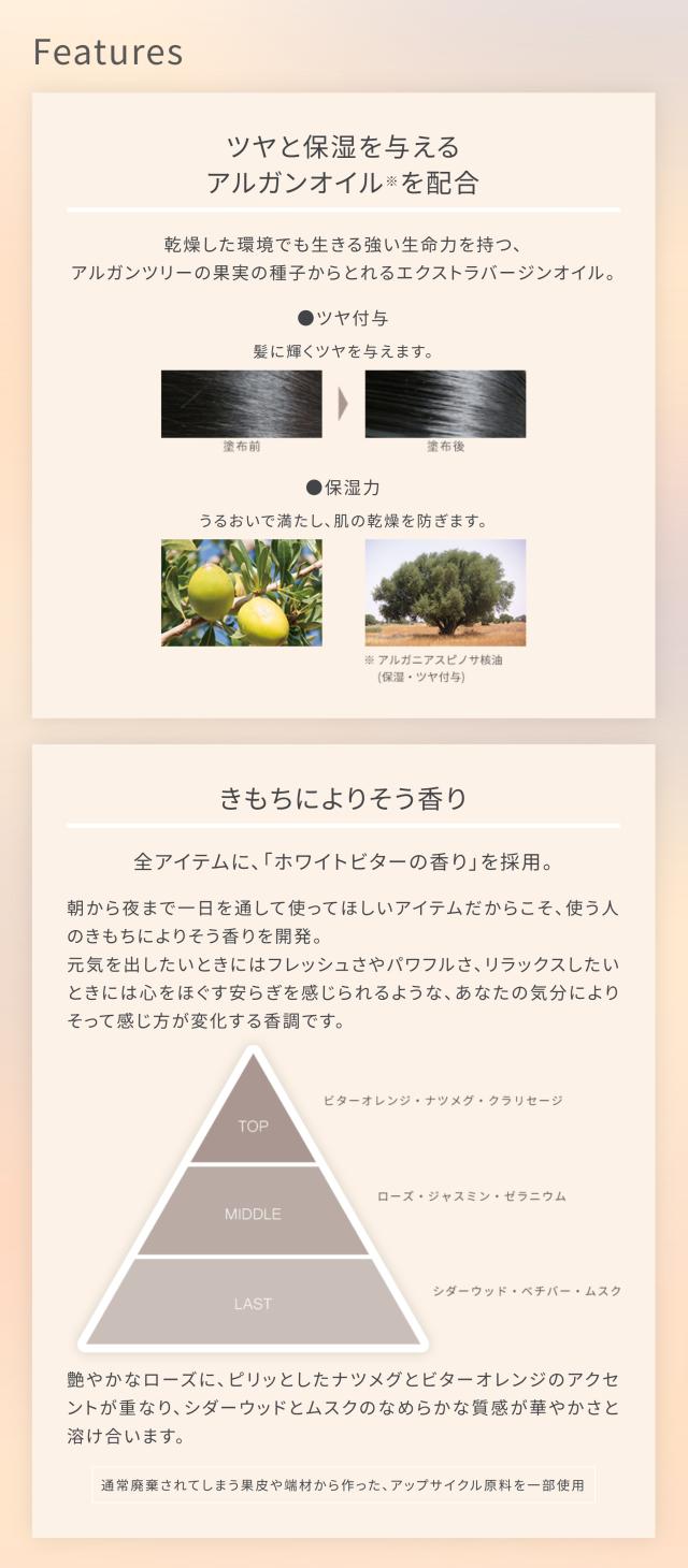 - 私はこの香りが好きです。1日の終わりにホッとするご褒美的な香りです。髪も艶とまとまりがあるのに、ふわふわと柔らかく気に入っています。