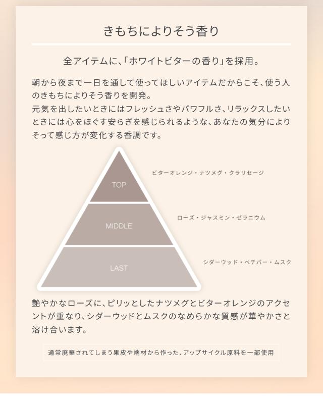 - お試し価格で購入しました。 ベタ付きもなく使い心地は良いのですが、ホワイトビターの香りがちょっと苦手です。もう少し爽やかな柑橘系の香りならリピしたいと思いました