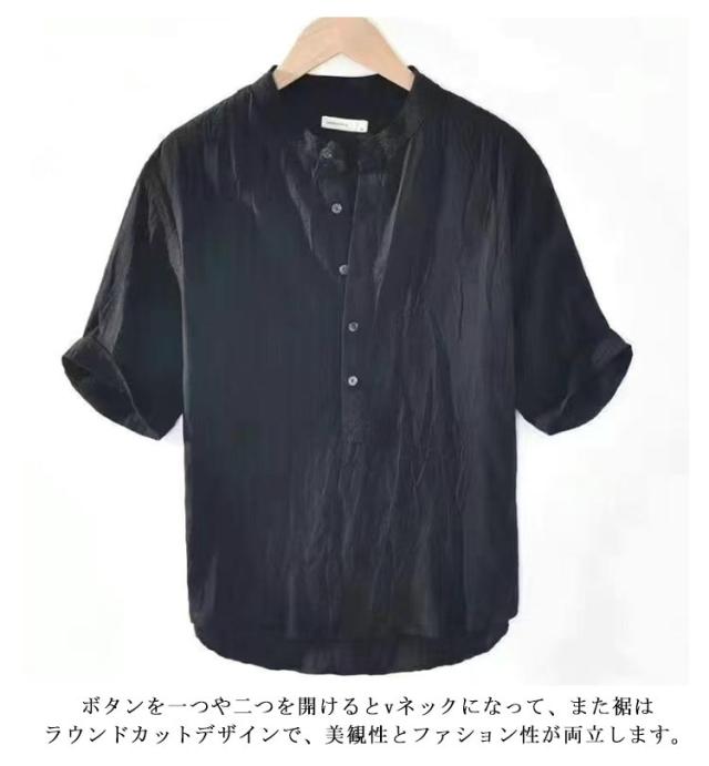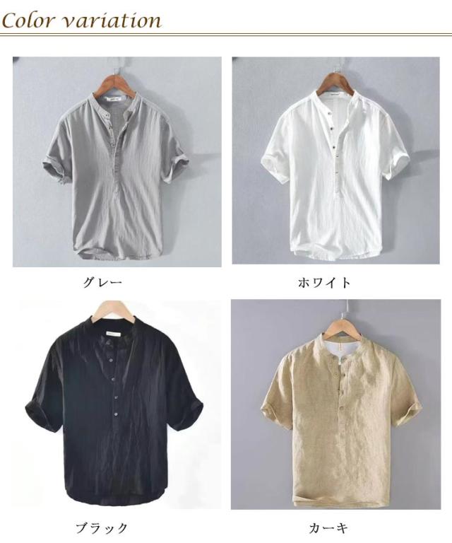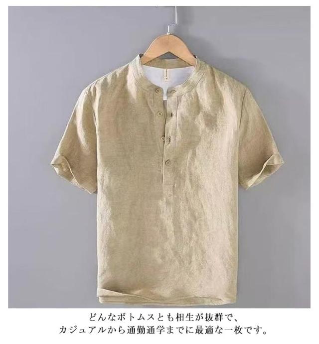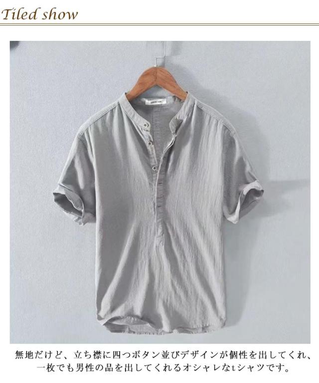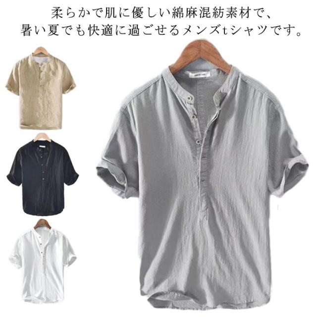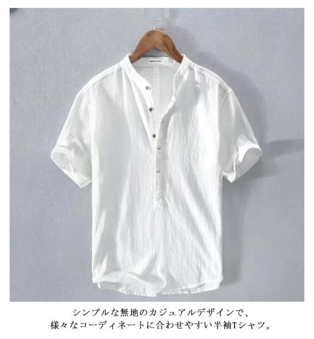 綿麻風 無地 軽量 薄手 半袖 メンズ リネンシャツ 夏 スタンドカラー シャツ カジュアルシャツ シンプル トップス おしゃれ 柔らかい カジュアル プルオーバー 体型カバー 通気性 ビジネス 通勤 トップス メンズファッション