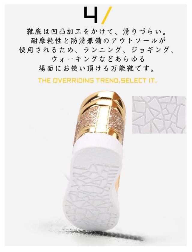 | ピカピカのメタリックスニーカーが登場。デザインが個性的でキラキラしてオシャレな一足。 アウトソールはあらゆる足の動きに柔軟に対応できるフレックスグルーブソールでクッション性抜群です。 靴底は凹凸加工をかけて、滑りづらい。耐摩耗性と防滑兼備のアウトソールが使用されるため、ランニング、ジョギング、ウォーキングなどあらゆる場面にお使い頂ける万能靴です。 通気性、軽量化、耐久性、反発性、柔軟性に優れ、防臭性もあるのスニーカーです。 ランニング、ジョギング、ウォーキング、クラブ、部活、ジムでのトレーニング、日常の学校や通学や通勤など、おしゃれなデザイン性で普段のカジュアルスタイルにも合わせやすい、オールラウンドに履けるをウォキングシューズです。 | |