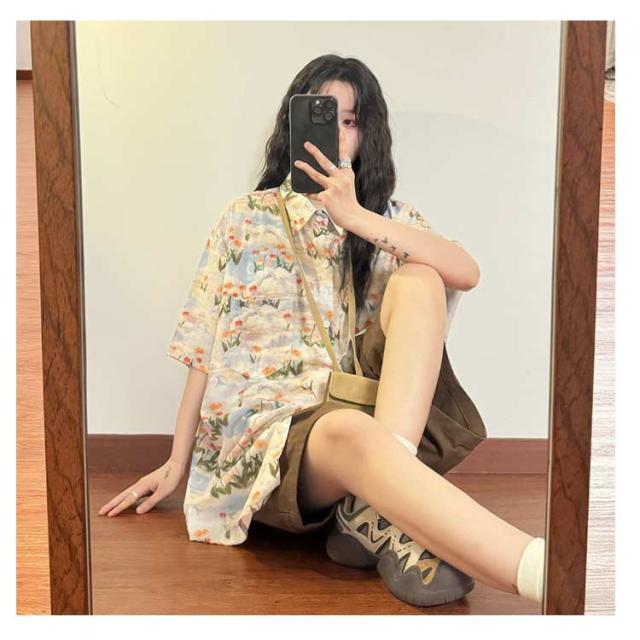 | 花柄がレトロかわいい半袖のアロハシャツ。 今年も柄シャツが大人気☆大人なチューリップデザイン♪ ゆったりしたサイズ感なので ボタンの調節でセクシーに着こなすことも出来ますね。 そのままでもかわいいですが、 インしてもおしゃれです。 | |