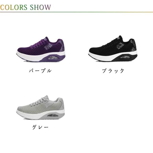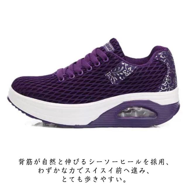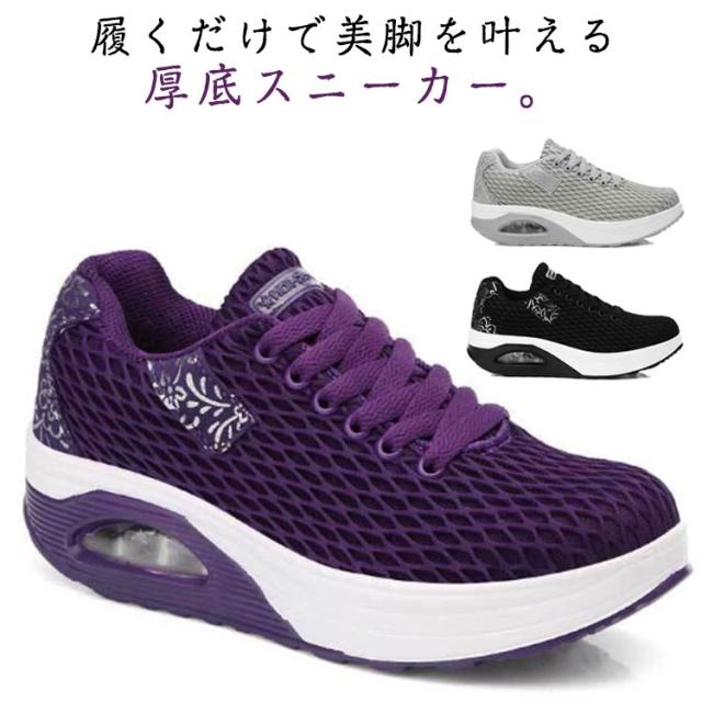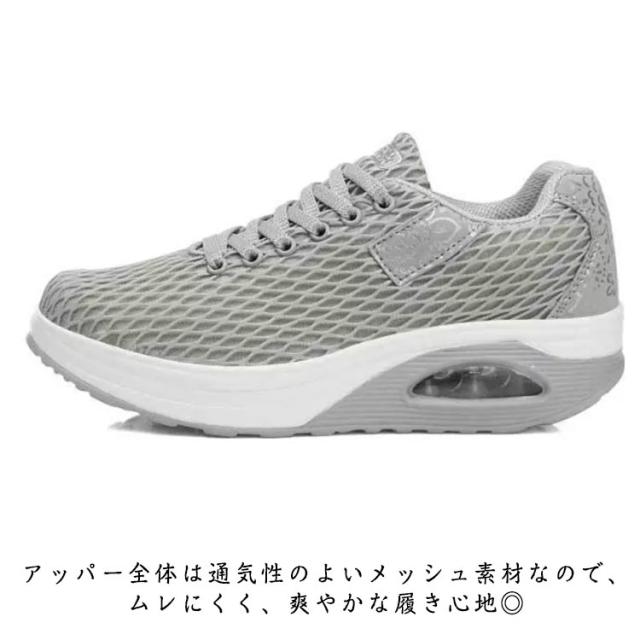 | 履くだけで美脚を叶える厚底スニーカー。 背筋が自然と伸びるシーソーヒールを採用、わずかな力でスイスイ前へ進み、とても歩きやすい。 ヒールにはエアークッションが入っているから、衝撃を吸収し、長時間の歩きも疲れにくく、ウォーキングや立ち仕事などの最適。 アッパー全体は通気性のよいメッシュ素材なので、ムレにくく、爽やかな履き心地◎ | |