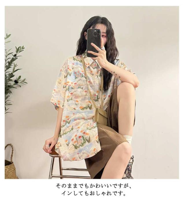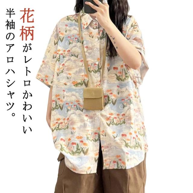総柄 チューリップ柄 夏物 半袖 シャツ シャツ ハワイアン UV対策 5分袖 アロハシャツ ハワイシャツ アロハシャツ 日焼け止め服 可愛い ゆったり 体型カバー 大きいサイズ ヴィンテージ風 シンプル カジュアル ストリートリゾート 旅行 海 ビーチ