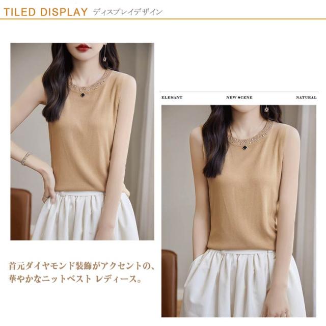 | 【可愛いと定番の丸首 ベスト レディース】 首元ダイヤモンド装飾がアクセントの、華やかなニットベスト レディース。 襟もとがリブ仕様でフィットするので、だらしなくなりすぎずニットベスト特有の抜け感に導きます。 程よくデザインされた定番のクルーネック仕様で、顔近くに視線を集めてくれて、 エレガントな女性スタイルを完成されるニットベストです。 自然に垂れる肩ラインが肩幅を整えて、肩幅が広い方にも華奢に見えて女性らしい印象に。 ストレッチ性のあるしっかりとしたニットは大人スタイルにピッタリのベストです。 | |