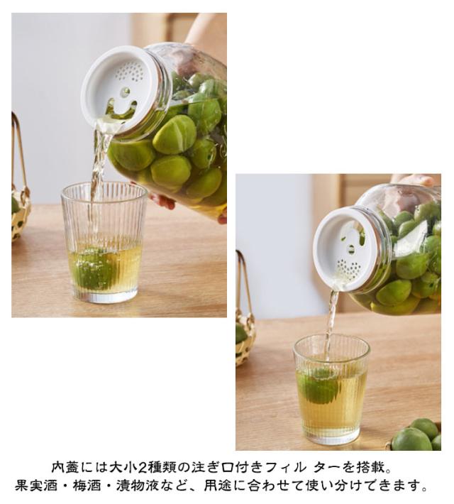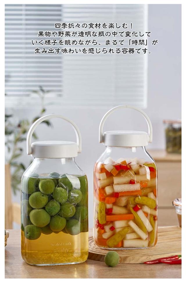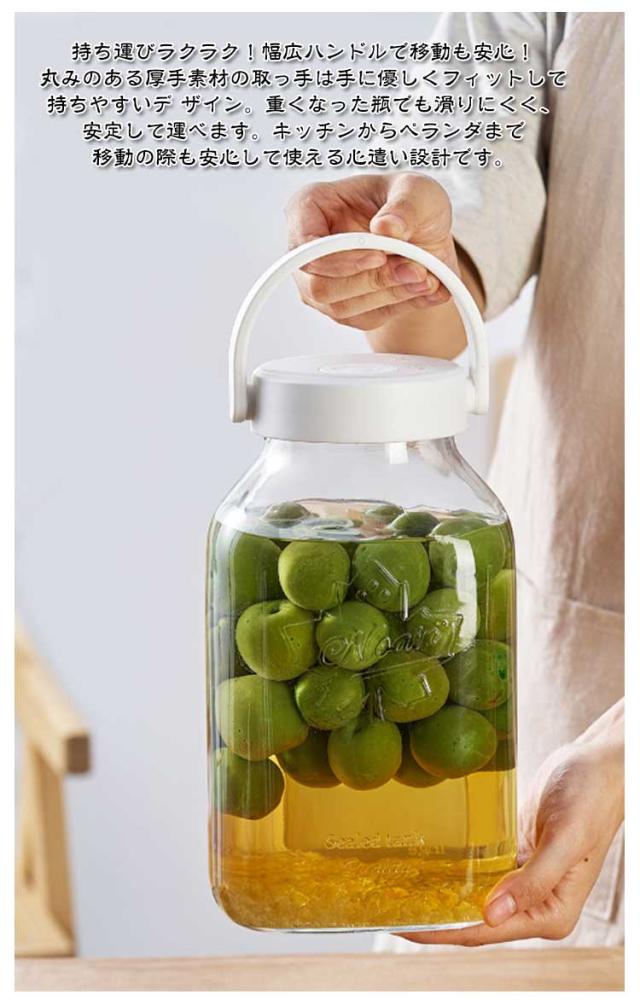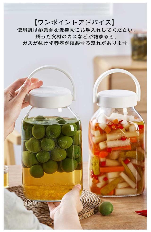 | ワンウェイ排気で密閉キープ!ガラス容器。 四季折々の食材を楽しむ!果物や野菜が透明な瓶の中で変化していく様子を眺めながら、まるで「時間」が生み出す味わいを感じられる容器です。 密閉構造で 漏れにくい。 日付記録付きで管理ラクラク! ワンウェイ排気弁付き!手動でのガス抜きは不要! 発酵によって発生したガスは、小さな排気穴から一方向に自然に排出されます。 外気は入りにくいため、瓶内はしっかり密閉状態を キープ。 これにより、風味を損なわずに発酵をスムーズに進行。 美味しい飲み頃を逃さない設計です。 【ワンポイントアドバイス】使用後は排気弁を定期的にお手入れしてください。残った食材のカスなどが詰まると、ガスが抜けず容器が破裂する恐れがあります。 日付記録ダイヤル付き!漬け始めた日をひと目で確認! 蓋部分にはシリコン製の回転式日付ダイヤルを搭載。漬け始めの日付を簡単に記録できるので、ベストな飲み頃・食べ頃を逃しません。見た目もすっきり、機能的な設計で初心者から本格派まで、安心してお使い いただけます。 持ち運びラクラク!幅広ハンドルで移動も安心!丸みのある厚手素材の取っ手は手に優しくフィットして持ちやすいデ ザイン。重くなった瓶でも滑りにくく、安定して運べます。キッチンからペランダまで移動の際も安心して使える心遣い設計です。 二重密閉構造でこぼれにくい。傾けても安心!しっかり密封! 内蓋と外蓋のダブル構造で、しっかり密閉しながらも中の液体を 漏らしません。傾けても液漏れしにくく、梅酒や果実酒など、発酵中でも安心 して保管&移動できます。 内蓋には大小2種類の注ぎ口付きフィル ターを搭載。果実酒・梅酒・漬物液など、用途に合わせて使い分けできます。 広口設計で取り出しやすい。スプーンやトングもそのまま使える。瓶口が広めに設計されているので、漬けた果実や野菜もそのまま取り出しやすく、飲み物として楽しむときも、具材の盛り付けもスムーズ!使いやすさにこだわった、日々の手間を減らす工夫です。 | |