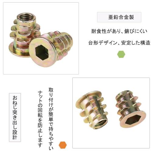 【耐久性のある素材】インサートナットは耐食性・耐酸化性に優れた亜鉛合金製で、湿気の多い環境で使用しても錆びにくいです。ナットは強度が高く割れにくく、長期間安定した性能を維持できます。
