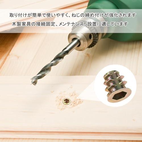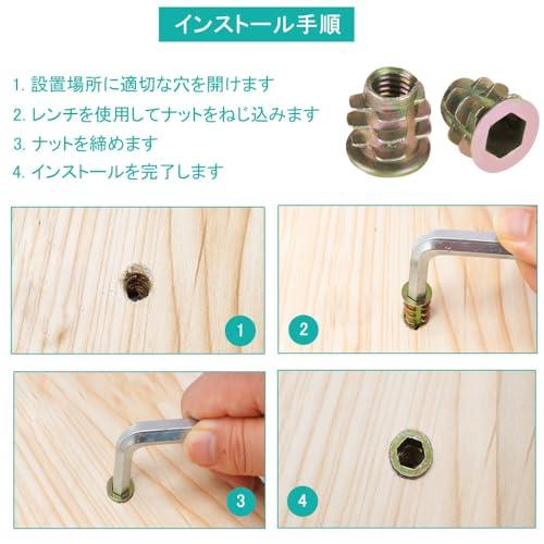 【取り付けが簡単】六角ソケットナットの取り付け手順は簡単で、まず木材に下穴を開け、下穴にインサートナットを差し込み、六角レンチで締め付けます。