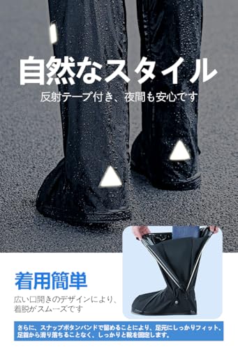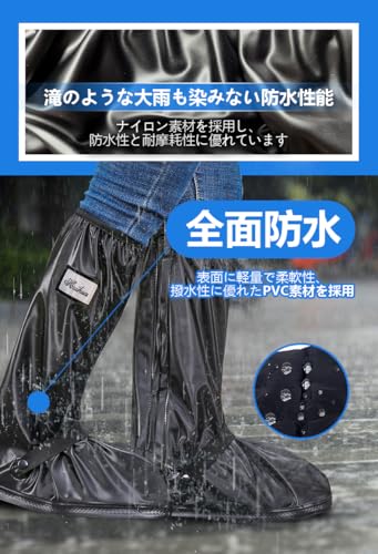 【防水性が高い】シューズカバーは完全防水のPVC素材で作られており、適度な厚みがあり、軽量で耐摩耗性に優れています。ジッパーと内側のファン防水層は二重防水設計で、水や汚れの浸入を防ぎます。靴にかぶせるだけで、大切な靴を水や泥から効果的に守ります。