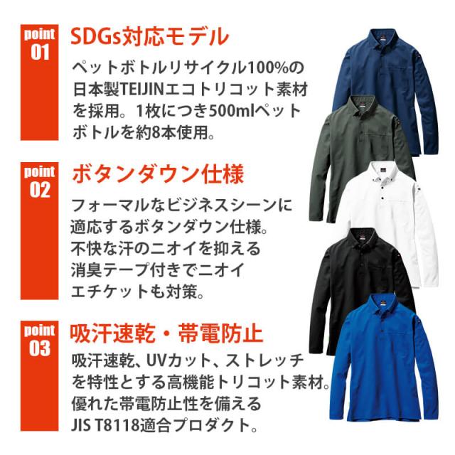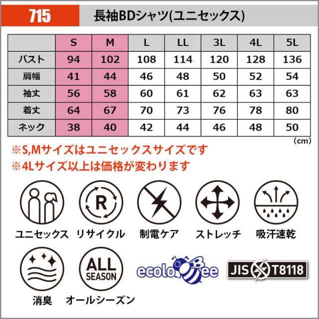 バートル 新作 2024 長袖BDシャツ ボタンダウン リサイクル素材 SDGs JIS T8118適合 吸汗速乾 715 BURTLE 春夏 夏用 SS 4L 5L 男女兼用 ユニセックス