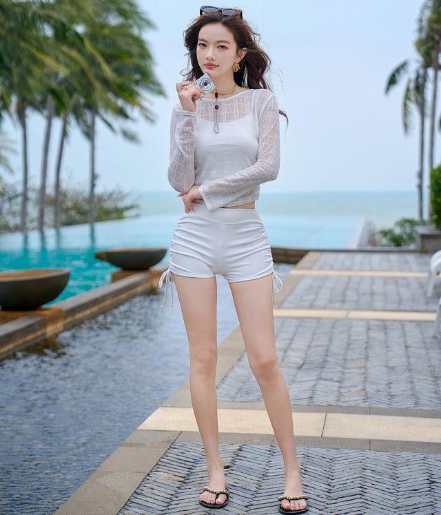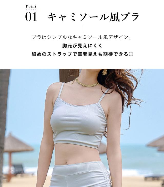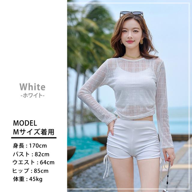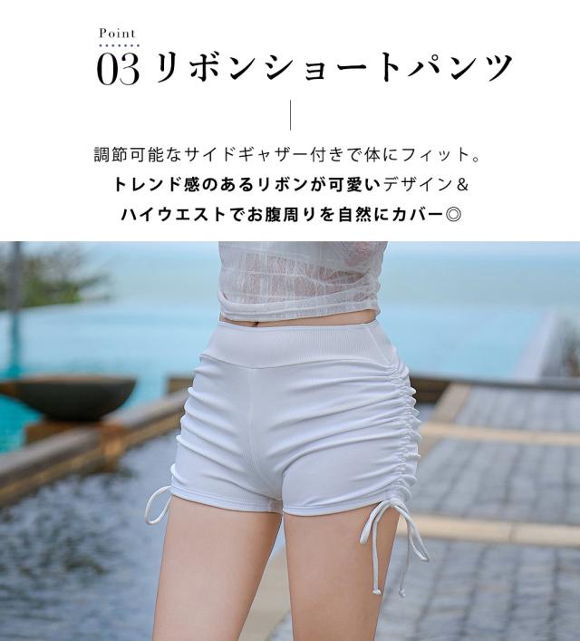 夏新作 水着 体型カバー レディース シアートップス 長袖 キャミキニ ブラ ショートパンツ 3点セット リブ クロップド丈 ギャザー カットアウト ハイウエスト リボン パッド付き ノンワイヤー バスト 盛れる 二の腕 ウエスト ヒップ カバーアップ 白