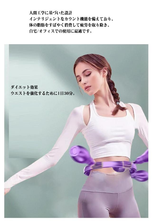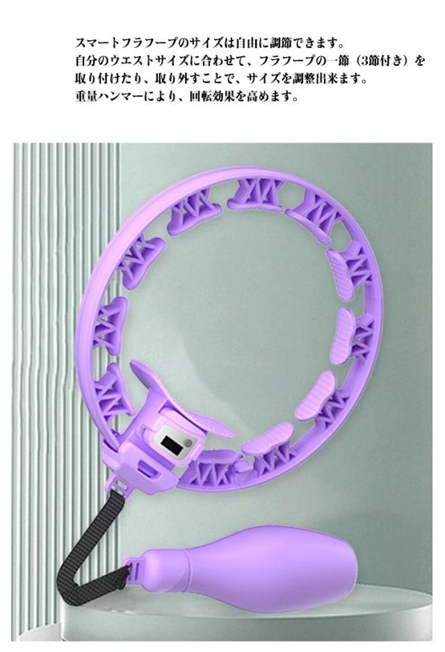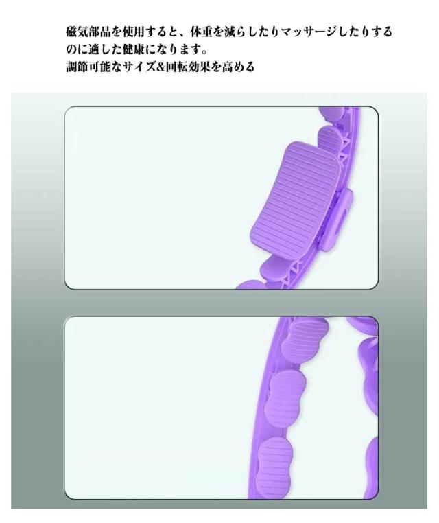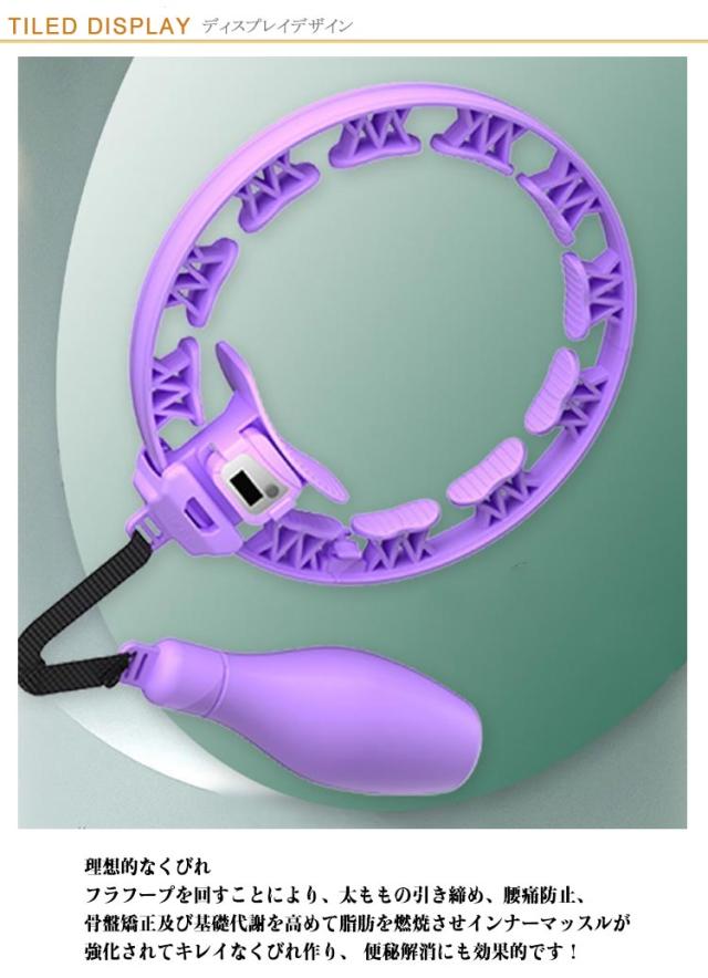 | 理想的なくびれ フラフープを回すことにより、太ももの引き締め、腰痛防止、骨盤矯正及び基礎代謝を高めて脂肪を燃焼させインナーマッスルが強化されてキレイなくびれ作り、 便秘解消にも効果的です! ダイエット効果 脂肪燃焼の高速化-通常のフラフープの2〜3倍の速さで脂肪を燃焼。ウエストを強化するために1日30分。 人間工学に基づいた設計 インテリジェントなカウント機能を備えており、体の脂肪をすばやく消費して疲労を取り除き、自宅/オフィスでの使用に最適です。磁気部品を使用すると、体重を減らしたりマッサージしたりするのに適した健康になります。 調節可能なサイズ&回転効果を高める スマートフラフープのサイズは自由に調節できます。自分のウエストサイズに合わせて、フラフープの一節(3節付き)を取り付けたり、取り外すことで、サイズを調整出来ます。重量ハンマーにより、回転効果を高めます。また、従来のスマートフラフープより、より簡単に組み立てます。 | |