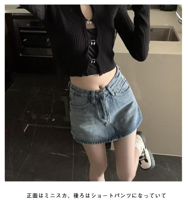 | ミニスカート風ショートパンツ 正面はミニスカ、後ろはショートパンツになっていて スカートの中が見えず安心なデニム地のミニスカパン。 タイトめなトップスを合わせた大人っぽい綺麗めカジュアルスタイルがオススメ! スカートとパンツの一体型で可愛いく、アクティブにも動ける万能ボトムス インナーを穿かずに着用できて安心・便利! | |