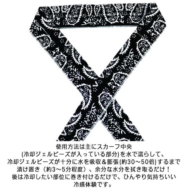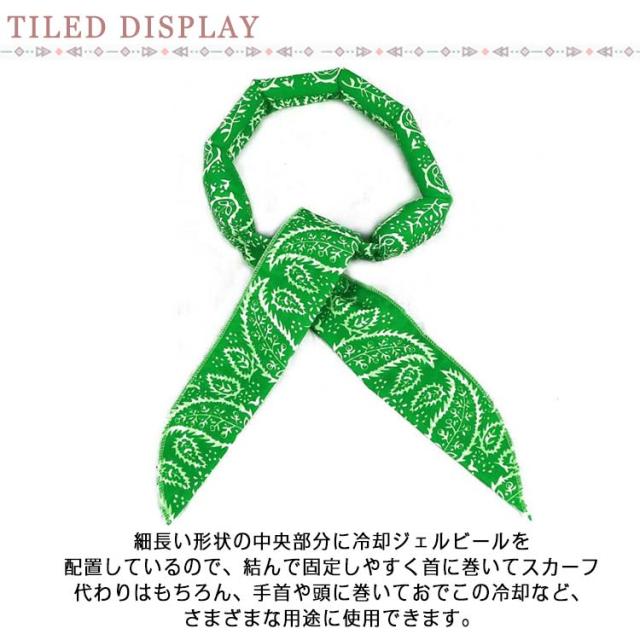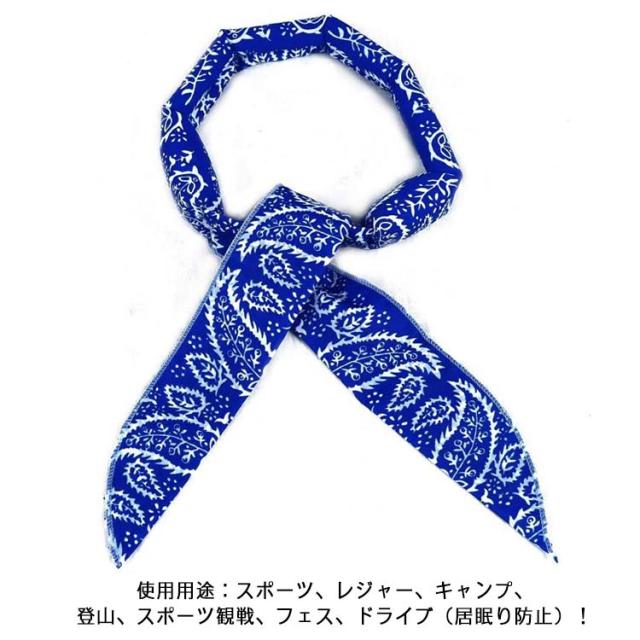 | 濡らすだけでひんやり冷感スカーフです。 細長い形状の中央部分に冷却ジェルビールを配置しているので、結んで固定しやすく首に巻いてスカーフ代わりはもちろん、手首や頭に巻いておでこの冷却など、さまざまな用途に使用できます。 スカーフを水に10‐20分程度浸し、余分な水を絞りご使用ください。繰り返し何度でも使えます。 ユニバーサルサイズで、ほとんどの女性、男性、ペットに適しています。 使用方法は主にスカーフ中央(冷却ジェルビーズが入っている部分)を水で濡らして、冷却ジェルビーズが十分に水を吸収&膨張(約30〜50倍)するまで漬け置き(約3〜5分程度)、余分な水分を拭き取るだけ!後は冷却したい部位に巻き付けるだけで、ひんやり気持ちいい冷感体験です。 使用用途:スポーツ、レジャー、キャンプ、登山、スポーツ観戦、フェス、ドライブ(居眠り防止)! | |