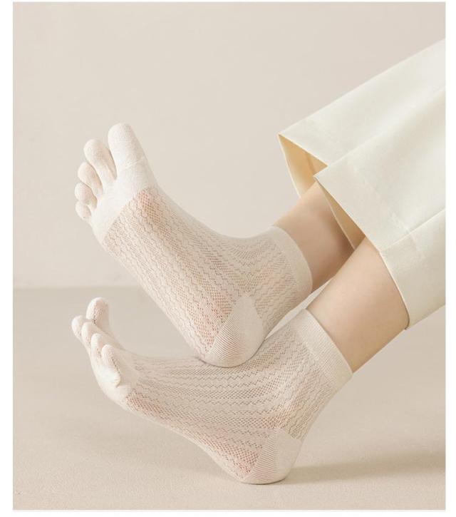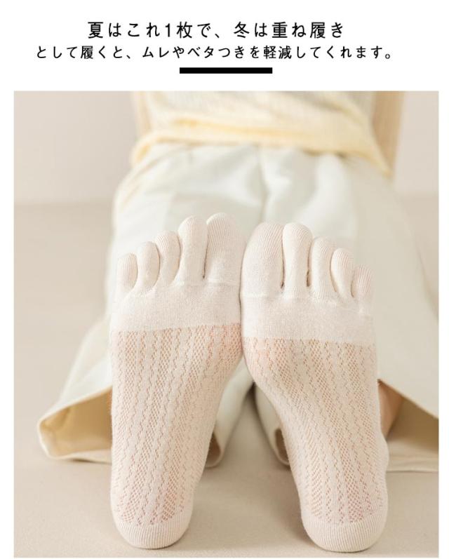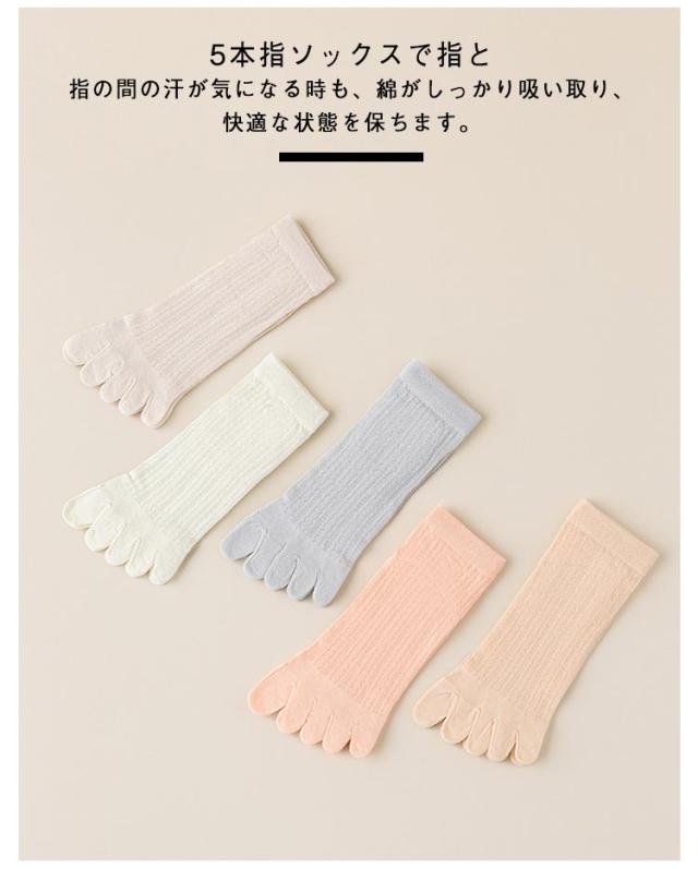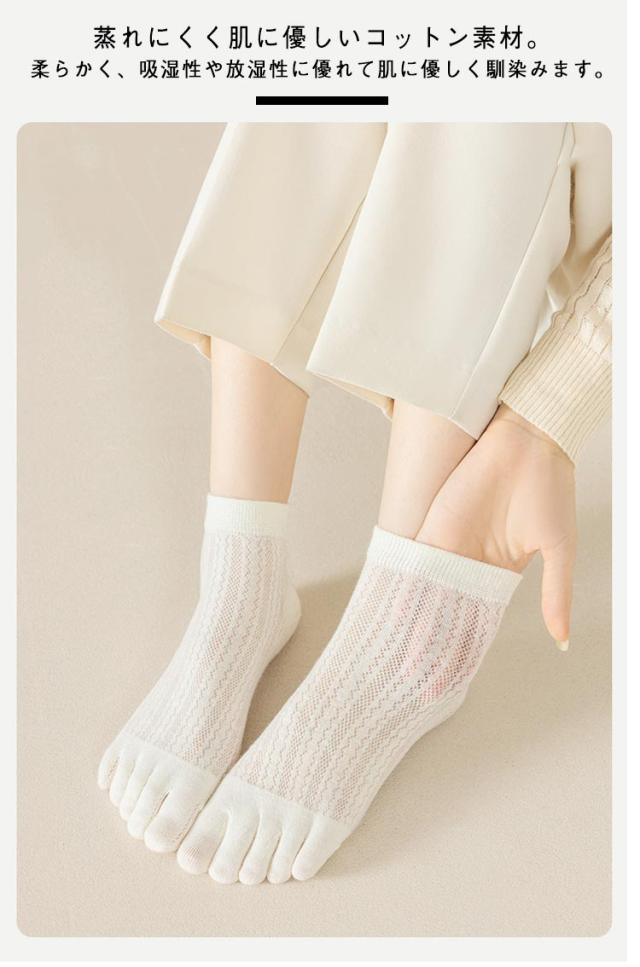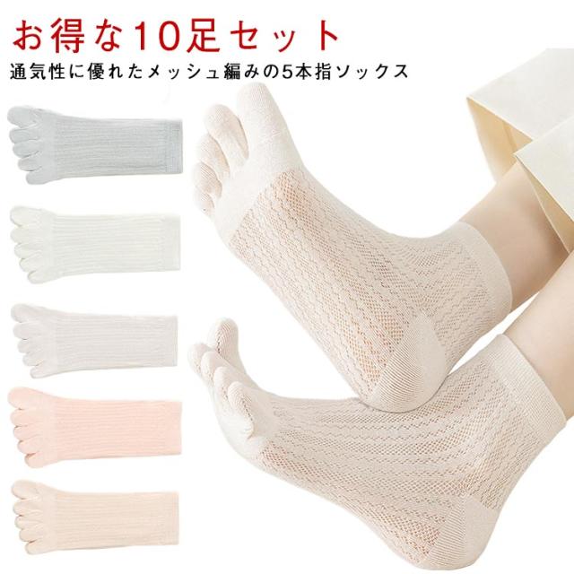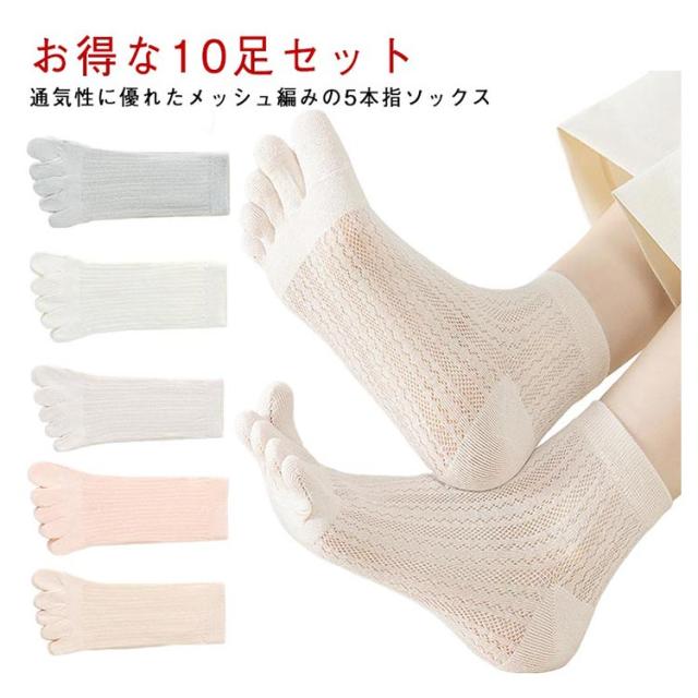 | 【お得な10足セット】【通気性に優れたメッシュ編みの5本指ソックス】 蒸れにくく肌に優しいコットン素材。柔らかく、吸湿性や放湿性に優れて肌に優しく馴染みます。 5本指ソックスで指と指の間の汗が気になる時も、綿がしっかり吸い取り、快適な状態を保ちます。 夏はこれ1枚で、冬は重ね履きとして履くと、ムレやベタつきを軽減してくれます。 | |