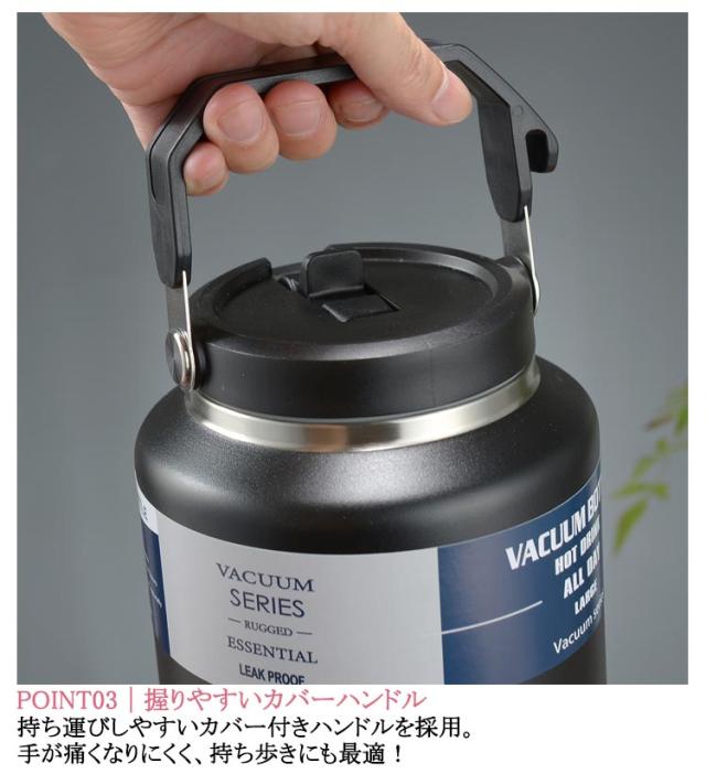 | 真空断熱 大容量魔法瓶 1500ml / 2000ml|スポーツ・アウトドア・ジムに最適な水筒 POINT01|マグネット式キャップで使いやすい! 片手で開け閉めラクラク!キャップはマグネットでしっかり固定され、開けてそのまま直飲み可能。 忙しい時や運動中にもスムーズに水分補給できます。 POINT02|二重密封で漏れない安心構造 高性能シーリングで転倒しても漏れにくい設計。 アウトドアや車内でも安心して使える魔法瓶です。 POINT03|握りやすいカバーハンドル 持ち運びしやすいカバー付きハンドルを採用。 手が痛くなりにくく、持ち歩きにも最適! POINT04|食品級ステンレス採用 内側は304ステンレス製で抗菌性・耐錆性に優れ、毎日清潔に使用可能。 お子様から大人まで安心して使える素材です。 POINT05|広口&大容量で使いやすい 氷も入れやすい広口設計で洗いやすく、お手入れ簡単! 1.5L/2Lの大容量で一日中しっかり水分補給。 POINT06|長時間保温・保冷! 5層構造の真空断熱技術で、冷たい飲み物は冷たく、温かい飲み物は温かくキープ。 アウトドア・スポーツ時にも最適な機能性です。 多用途で大活躍! キャンプ・ジム・ランニング・登山・ピクニック・スポーツ観戦・お仕事・車内常備など、 さまざまなシーンで便利にお使いいただけます。 | |