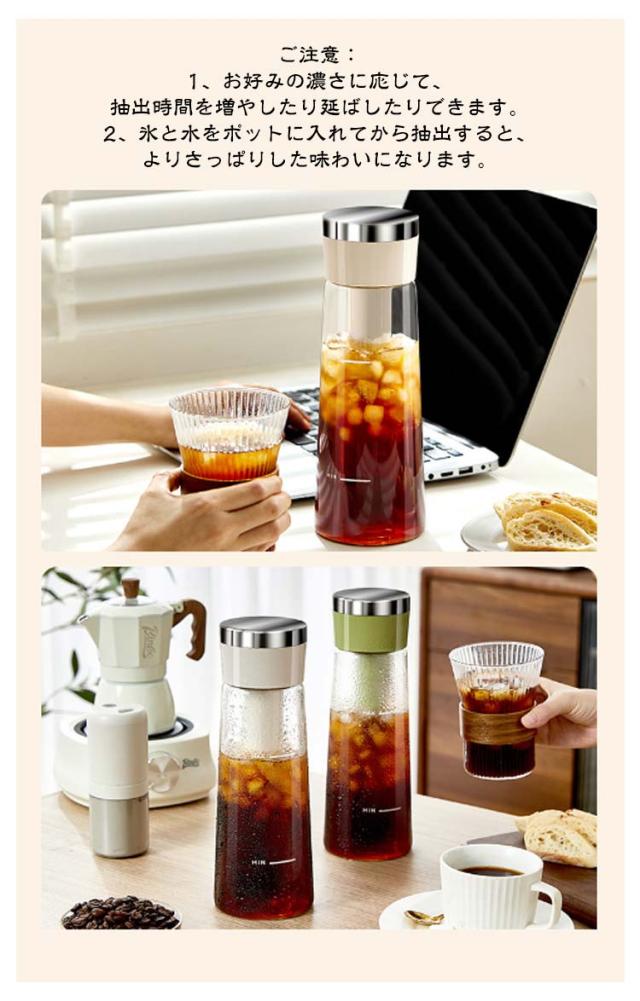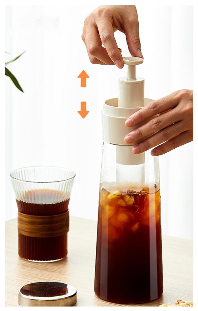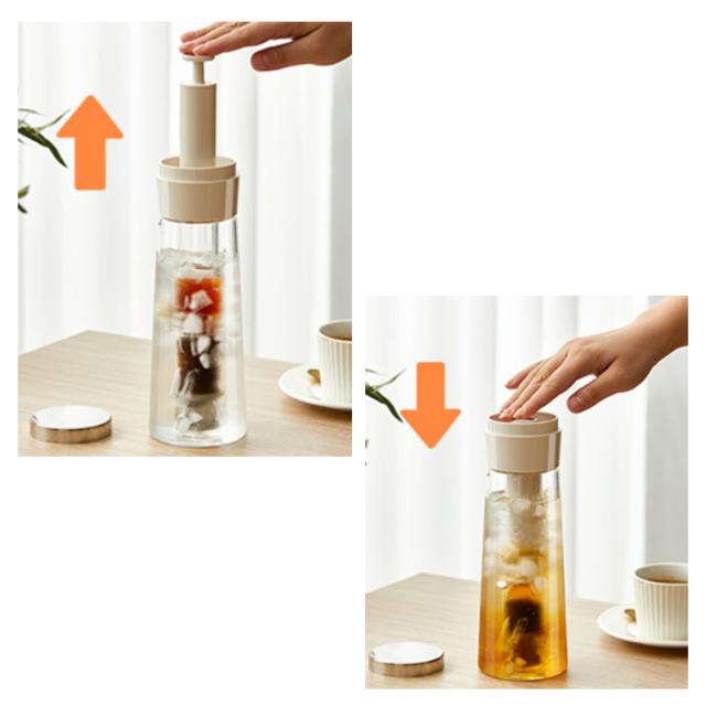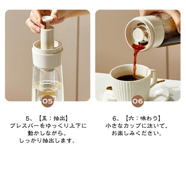 | 水出しコーヒーポット。 大容量 750ml!一度でたっぷり飲める大容量設計。 家庭やパーティーに最適!家庭用や多人数が集まるシーンにぴったりの容量。 使用方法(使い方): 1、【一:入れる】フィルターを取り出し、中挽きのコーヒー粉または茶葉を適量入れます。 2、【二:セット】フィルターを回して本体にしっかり装着します。 3、【三:締める】フィルター付き本体をカップにねじ込んでしっかり締めます。 4、【四:注ぐ】ポットの最大水位線以内で、風味や濃さの好みに合わせて適量の純水を注ぎます。 5、【五:抽出】プレスバーをゆっくり上下に動かしながら、しっかり抽出します。 6、【六:味わう】小さなカップに注いで、お楽しみください。 ご注意: 1、お好みの濃さに応じて、抽出時間を増やしたり延ばしたりできます。 2、氷と水をポットに入れてから抽出すると、よりさっぱりした味わいになります。 | |