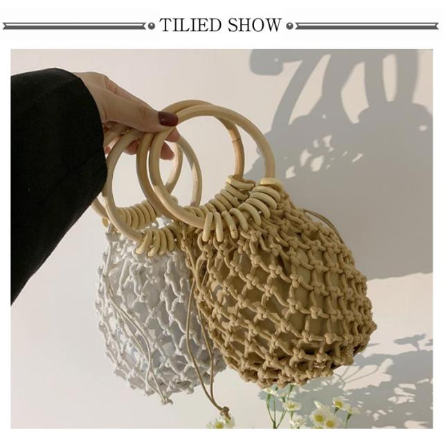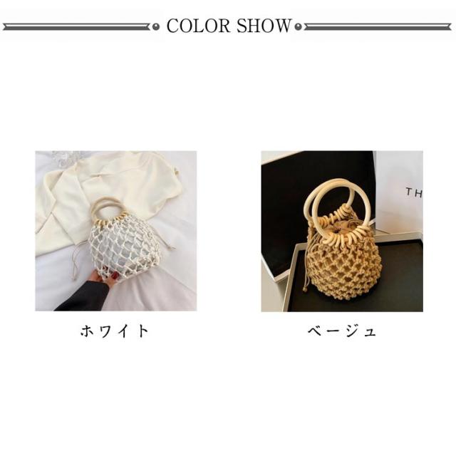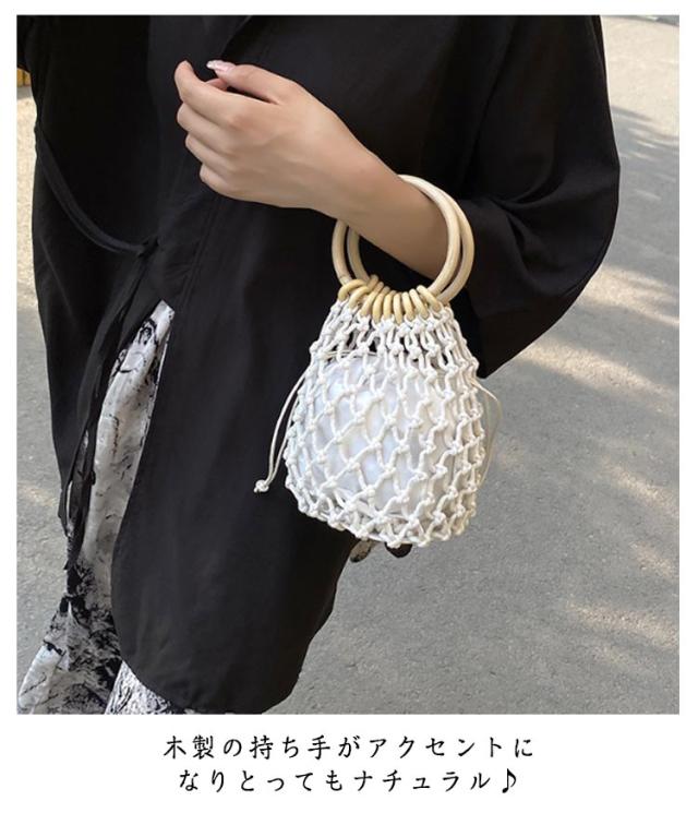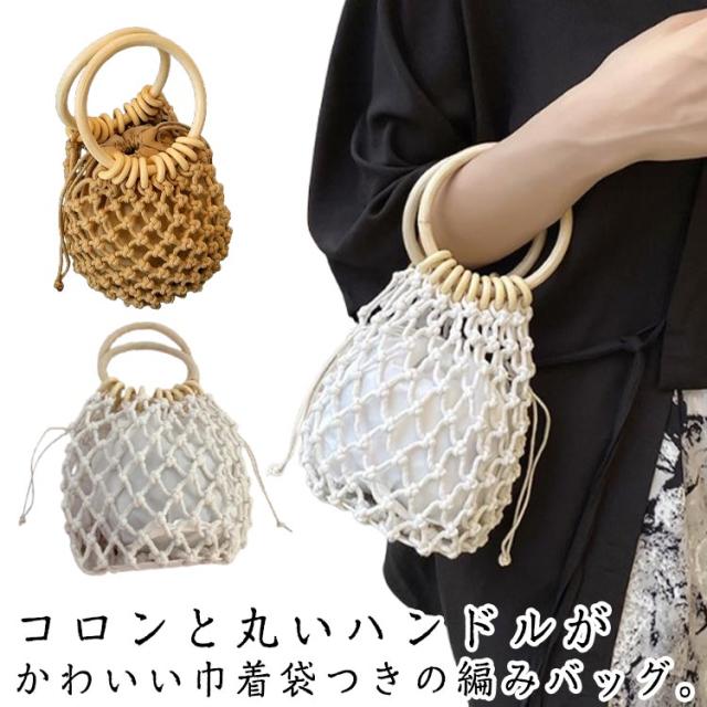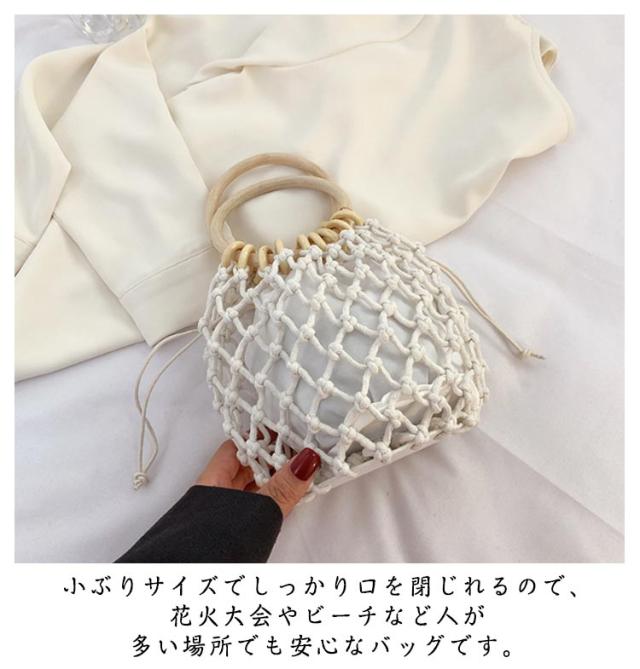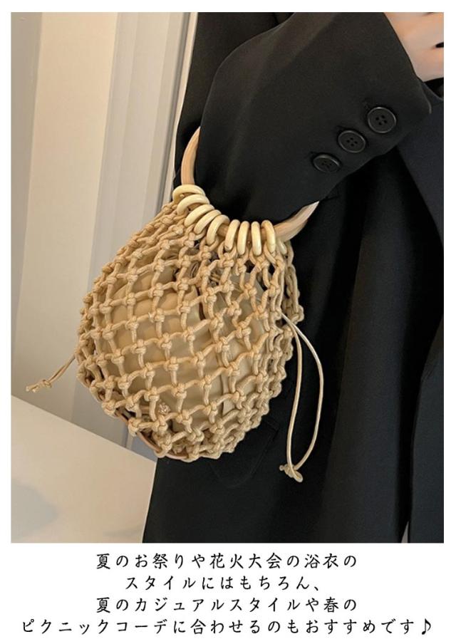 | コロンと丸いハンドルがかわいい巾着袋つきの編みバッグ。 木製の持ち手がアクセントになりとってもナチュラル♪ 巾着タイプの内布により、中身を見られずに愛用いただけます。 夏のお祭りや花火大会の浴衣のスタイルにはもちろん、夏のカジュアルスタイルや春のピクニックコーデに合わせるのもおすすめです♪ 小ぶりサイズでしっかり口を閉じれるので、花火大会やビーチなど人が多い場所でも安心なバッグです。 | |