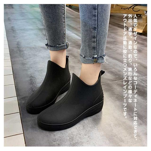 | 一体成型技術を施して、防水なので、雨・雪の日はもちろん、晴れの日に履いていても違和感がないレインシューズです。 アウトソールは凹凸がはっきりしたタンクソールを採用しているので濡れた地面でも滑りにくくて安心です。 PVCを採用しており通気性、耐摩耗性が優れ快適な履き心地! 脱ぎ履きしやすいサイドゴア。雨が止んでもおしゃれに履いていられます。 22.5cm-25.5cm幅広いサイズ展開! 人気のデザインなので、いろんなコーディネートに対応できて、外出、通学、通勤、釣り、旅行などの様々なアウトドア活動に役に立つメンズレインブーツです。 | |