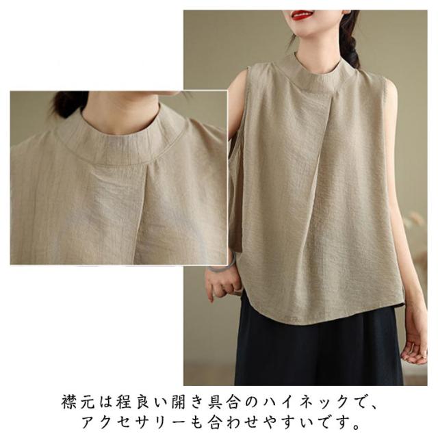 ノースリーブ タンクトップ ハイネック ブラウス ギャザー トップス シャツ ブラウス 夏ブラウス ギャザーブラウス フリルブラウス 涼しい レディース ゆったり オーバーサイズ ベージュ ブラック
