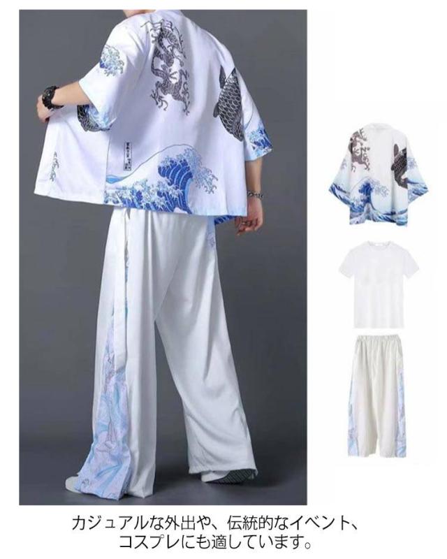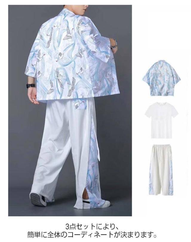 セットアップ メンズ 甚平 3点セット ワイドパンツ 涼しい 浴衣 カーディガン 和柄 セットアップ さらさら じんぺい 羽織り ロングパンツ 夏コーデ 部屋着 総柄 春 夏 花火大会