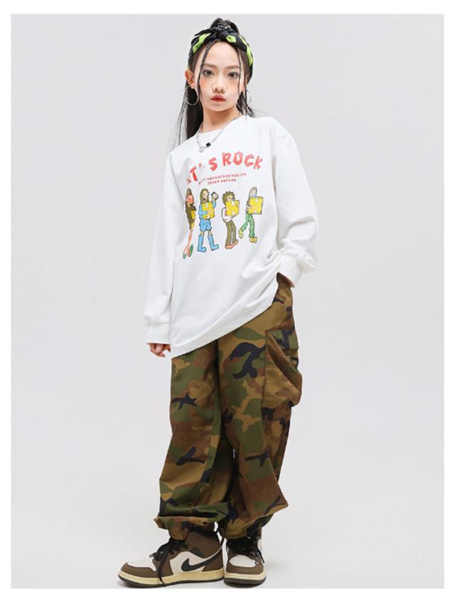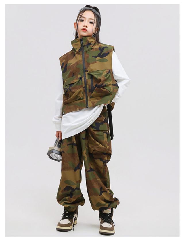 ショート 迷彩 上下3点セット おしゃれ ヒップホップ ダンス衣装 セットアップ ベスト ロングtシャツ 黒 白 おしゃれ 長袖 女の子 男の子 かっこいい ファション ジャズダンス ポッピング カーゴパンツ トップス カジュアルシャツ 上下3点セット 団体服 発表会 演出服 応援団