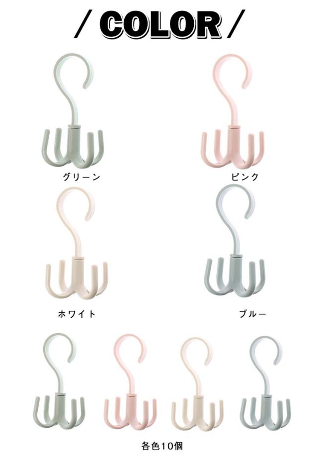 | 360°回転 4フック式 小物ハンガー 【40個セット】 フック式の小物ハンガーです。 バッグやベルト、ネクタイなどの小物類をスッキリ収納◎ 360°回転するので、取り出す時も便利です♪ カーブがしっかりついているので、物が滑り落ちにくいです。 小物ハンガーでお悩み解決 引っ掛けるだけ収納 <お勧めポイント> ●ポイント1 色んな小物を引っ掛けて収納できる ●ポイント2 回転するから小物が取りやすい ●ポイント3 セットでお届けするので色んなところで使える ●ポイント4 カラフルで柔らかな色をご用意しました | |