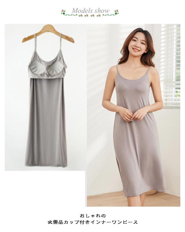 | カップ付きワンピース 透け防止 速乾 伸縮性 膝上丈/膝下丈 ◆おしゃれの必需品♪カップ付きインナーワンピース ◆心地よい肌触りの上質なインナーワンピース ◆一年を通してサラッと爽やかに、快適にお過ごし頂けます♪ ◆ブラカップ付きなので1枚着るだけでOKの楽チンアイテム♪ ◆一つ持っているだけでおしゃれをもっと楽しむことができます。 | |