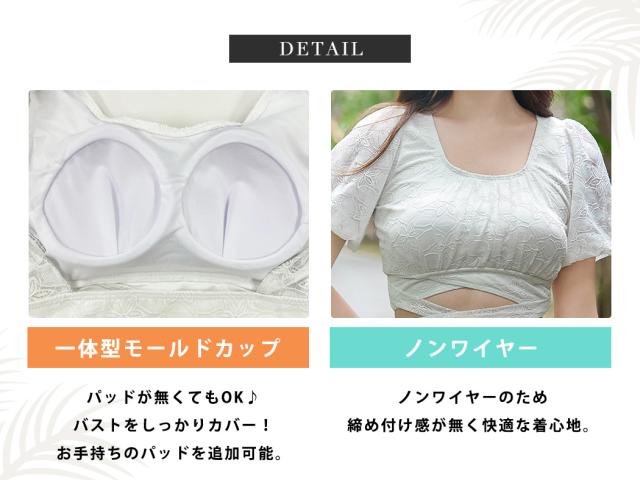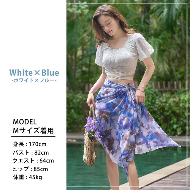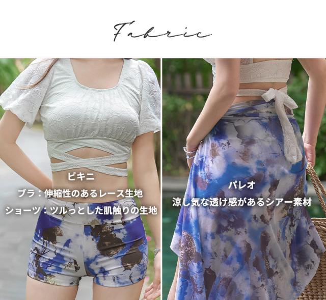 夏新作 水着 体型カバー レディース ブラ ショートパンツ パレオ 3点セット レース 半袖 パフスリーブ クロスデザイン ハイウエスト ノンワイヤー モールドカップ ホック バスト 盛れる 二の腕 ウエスト ヒップ 太もも 脚 カバーアップ 白