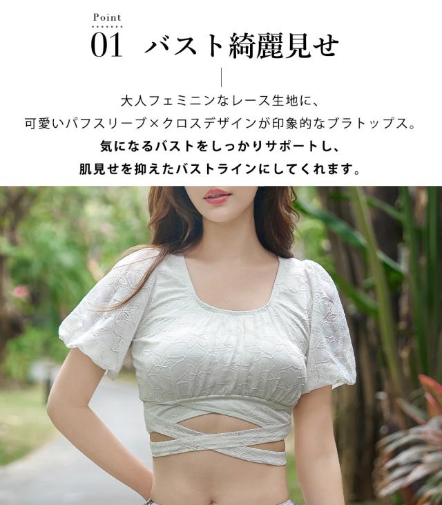 大人フェミニンなレース生地に、可愛いパフスリーブ×クロスデザインが印象的なブラトップス。