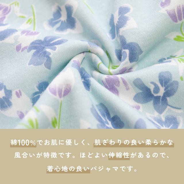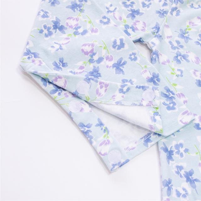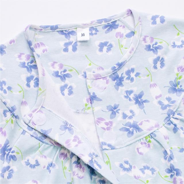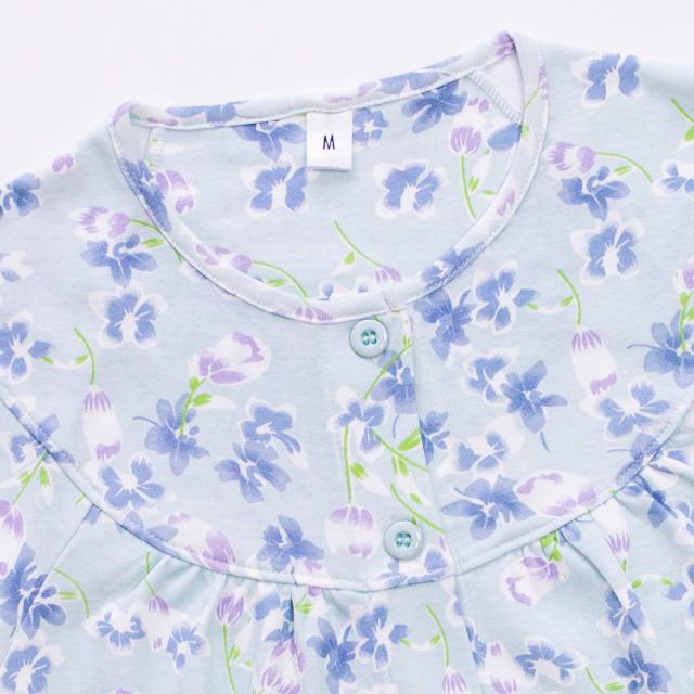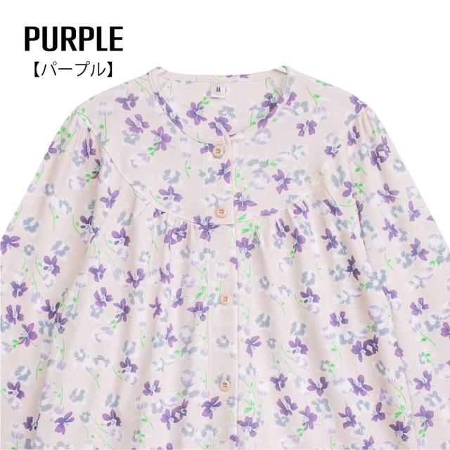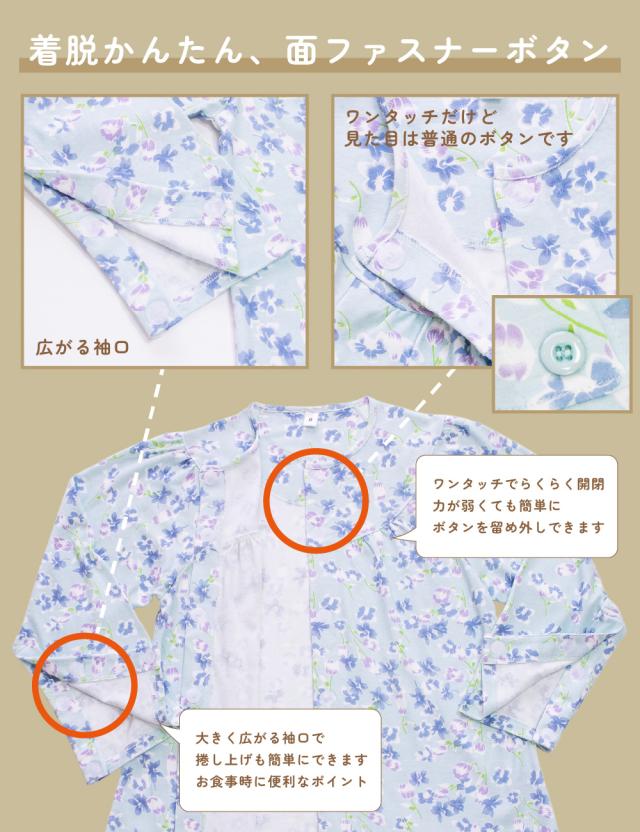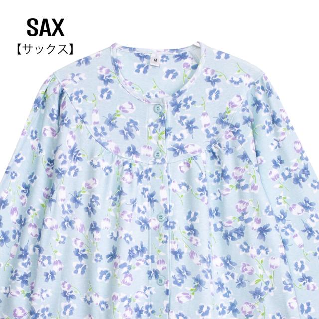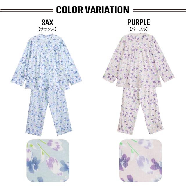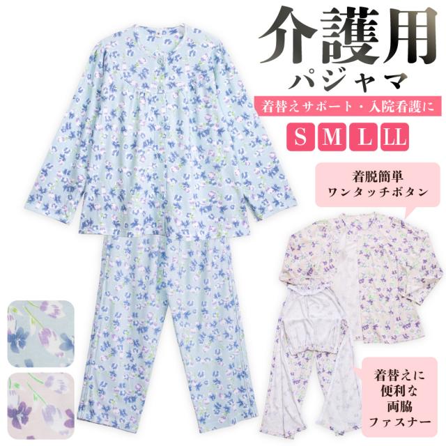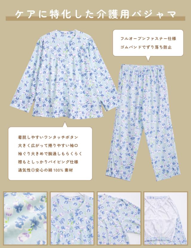 レディース 介護パジャマ 綿100% 長袖 春 秋 前開き スムース サックス パープル 花柄 S M L LL 婦人 介護用 入院 ケア おむつ交換 送料無料